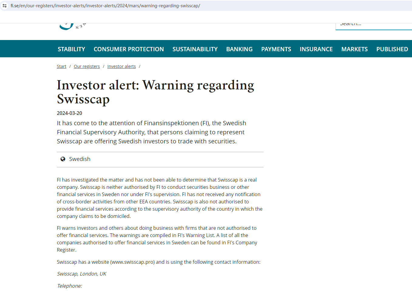 In addition, the Finansinspektionen (FI) issued a warning against Swisscap, stating that this broker is not entered in its commercial register.