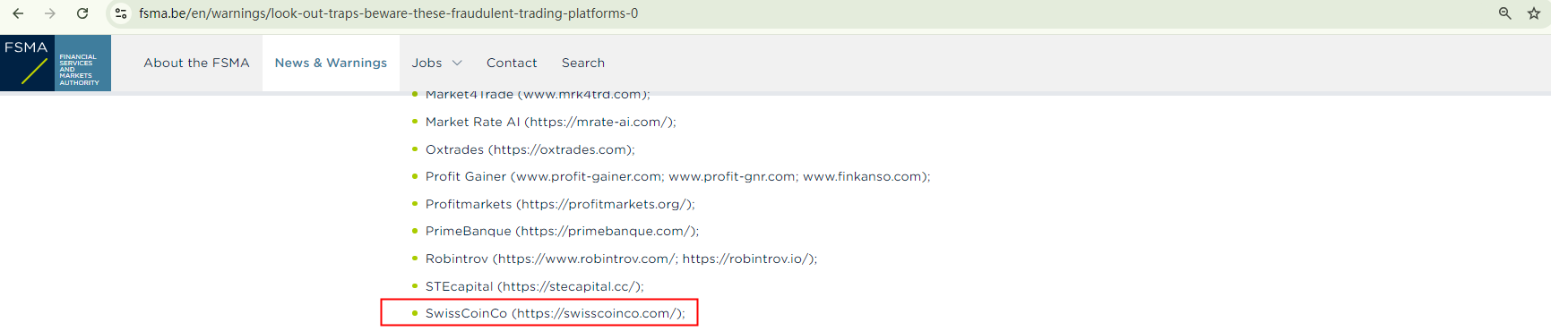 On August 29, 2024, the Belgian Financial Services and Markets Authority (FSMA) added Swisscoinco to its warning list as a fraudulent trading platform operating in the Belgian market and advised investors to stay away from it. https://www.fsma.be/en/warnings/look-out-traps-beware-these-fraudulent-trading-platforms-0