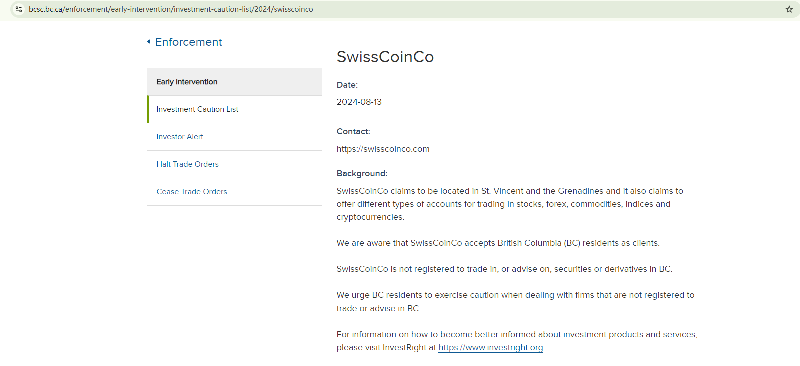 On August 13, 2024, the British Columbia Securities Commission (BCSC) issued a warning against SwissCoinCo, stating that this broker is not registered to trade in, or advise on, securities or derivatives in BC. https://www.bcsc.bc.ca/enforcement/early-intervention/investment-caution-list/2024/swisscoinco