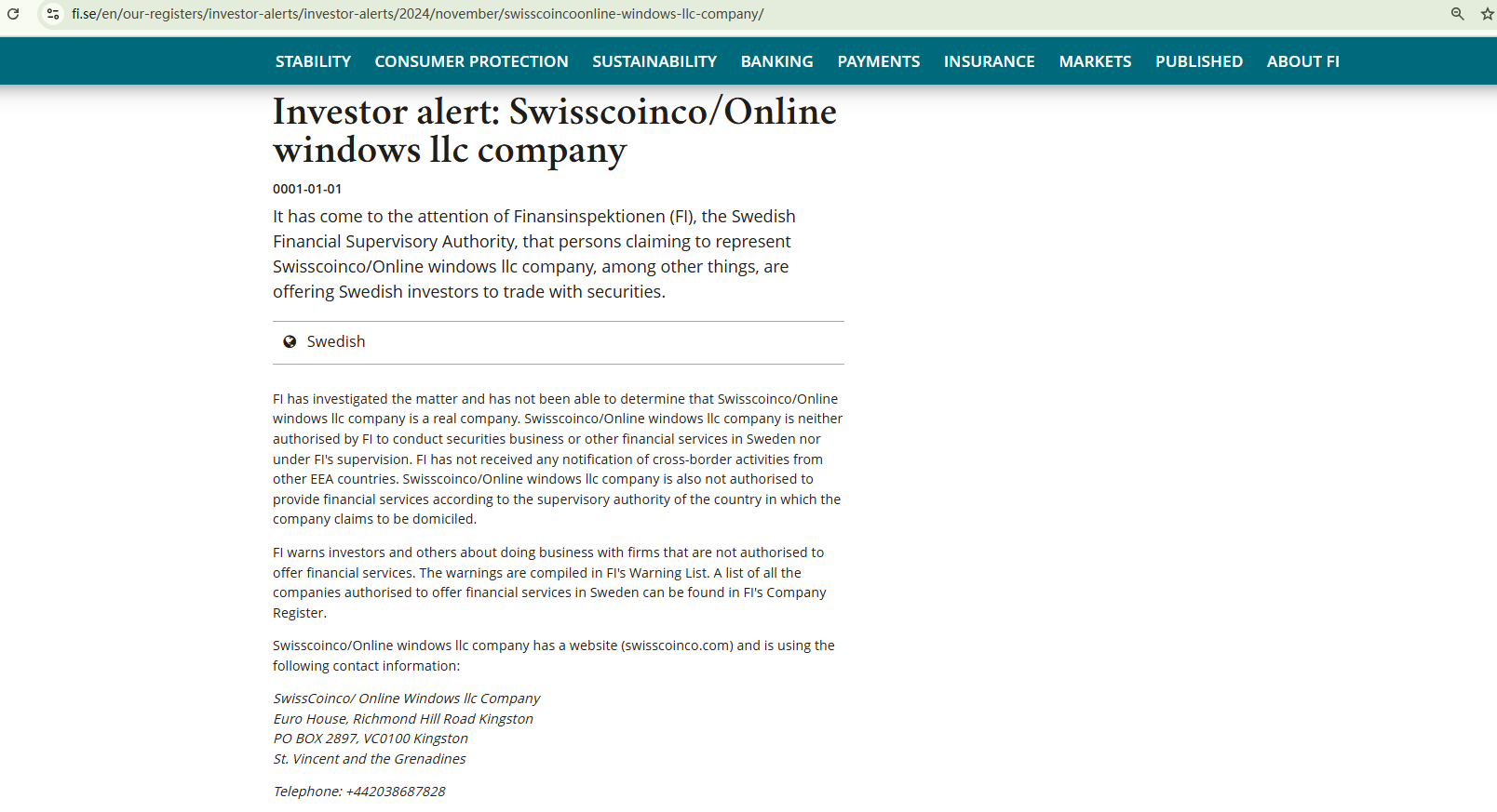 Finansinspektionen (FI), the Swedish Financial Supervisory Authority, has investigated Swisscoinco and warned investors to stay away from this unauthorized firm. https://www.fi.se/en/our-registers/investor-alerts/investor-alerts/2024/november/swisscoincoonline-windows-llc-company/