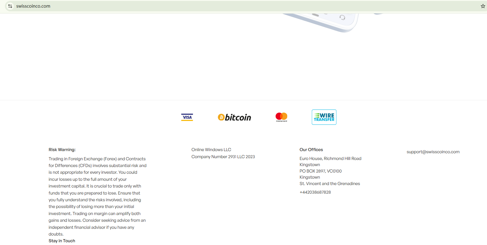Swisscoinco relies solely on its claimed registration in St. Vincent and The Grenadines to establish its legitimacy and credibility. However, the registration number it purports to have is currently under cancellation. Without any other valid licenses, Swisscoinco is suspected to be a scam due to its unlicensed status.