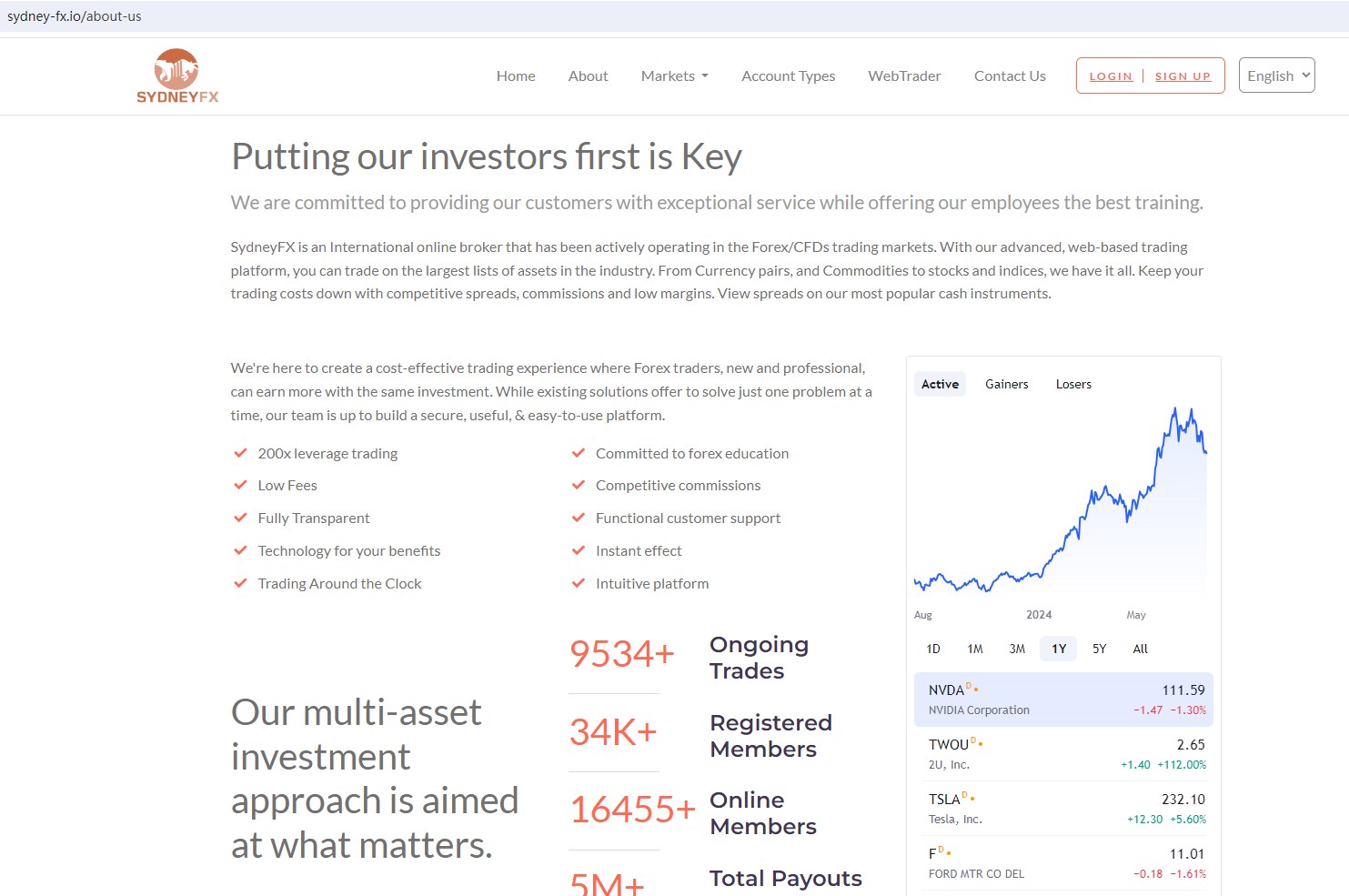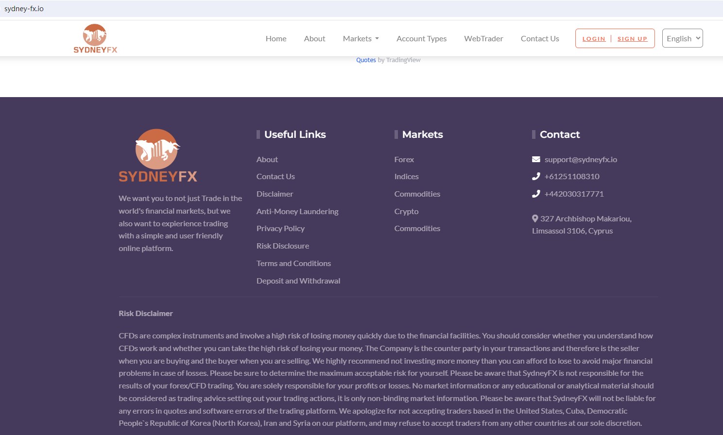 SydneyFX claims to be an International online broker located in Cyprus, offering wide range of financial services, including Crypto, Forex, Indices, Stocks, Energy, Commodities and more instruments in global markets. However, there is no detailed financial services licenses and other licensing certificates. A company that offers financial services must have financial license in the country where it is located.