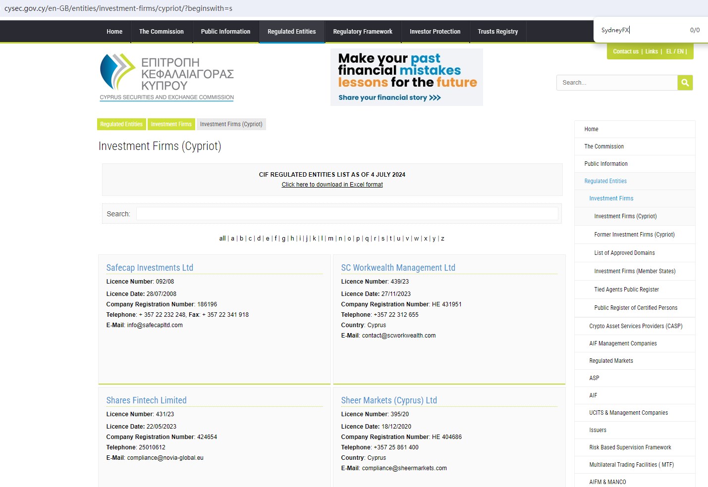Upon investigation, we found that SydneyFX is not regulated by the Cyprus Securities and Exchange Commission (CySEC).