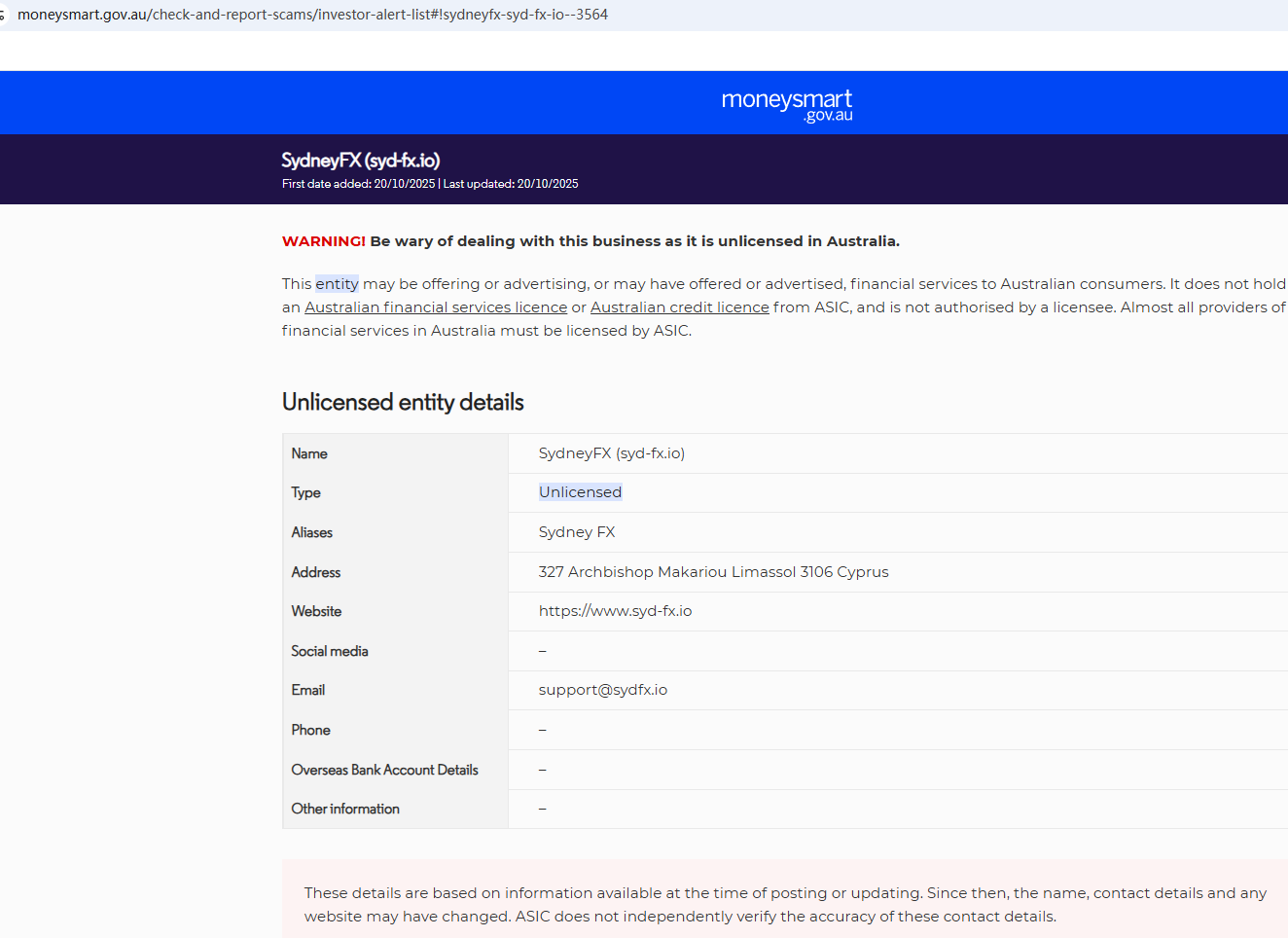 On Oct 20, 2025, the Australian Securities & Investments Commission (ASIC) issued a warning against SydneyFX, believing this company might be providing financial services or products without proper authorization. https://moneysmart.gov.au/check-and-report-scams/investor-alert-list#!sydneyfx-syd-fx-io--3564