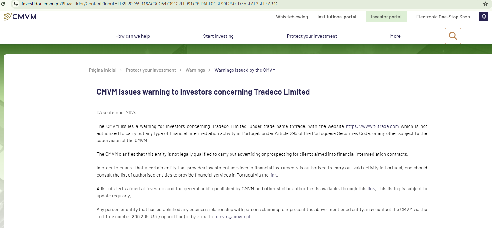 On September 3, 2024, the Portuguese Securities Market Commission (CMVM) issued a warning about T4Trade for operating in Portugal without the proper authorization. https://investidor.cmvm.pt/PInvestidor/Content?Input=FD2E20D65B48AC30C64799122EE991C95D6BF0CBF90E250ED7A5FAE35FF4A34C