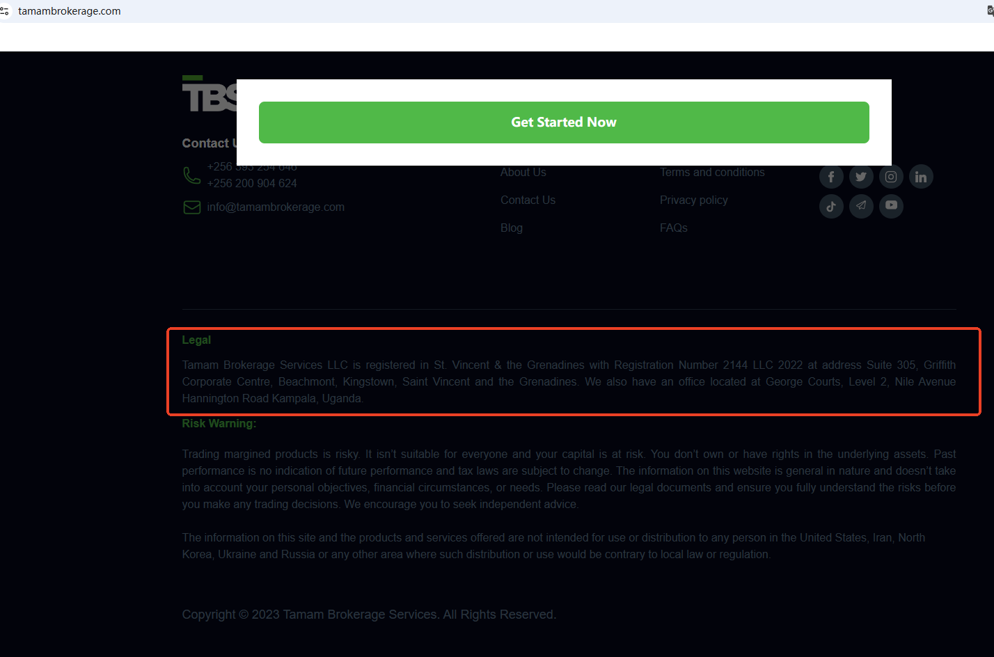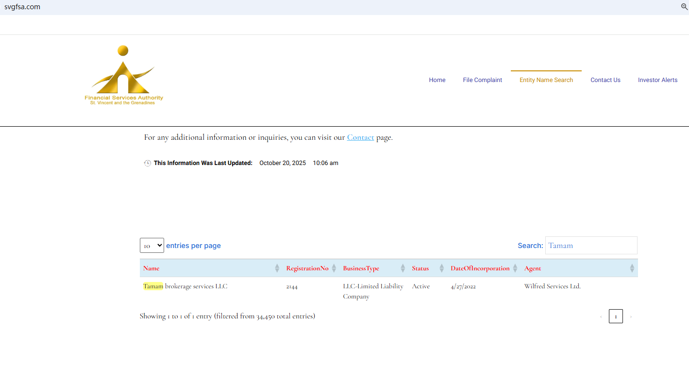 Tamam claims to be registered with the St. Vincent and the Grenadines Financial Services Authority (SVG FSA). While this registration remains valid, the SVG FSA does not have the authority to regulate forex and does not constitute a valid forex license. Furthermore, Tamam does not appear to be authorized by any reputable financial regulator, raising serious concerns about potential fraud.