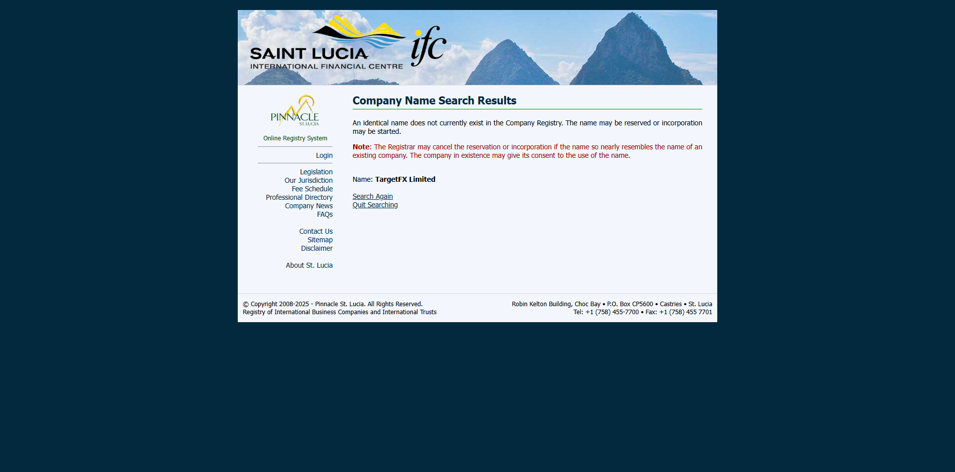 TargetFX claims to operate through TargetFX Limited, a company registered in Saint Lucia. Our search of the Saint Lucia International Financial Centre (IFC) registry shows that an identical company name is not currently registered. The name may be reserved, or the incorporation process may have been initiated but not yet completed. Besides, this registration only confers International Business Company (IBC) status. It is important to note that IBC status does not equate to a financial license. The IFC does not regulate or authorize entities for forex trading activities.