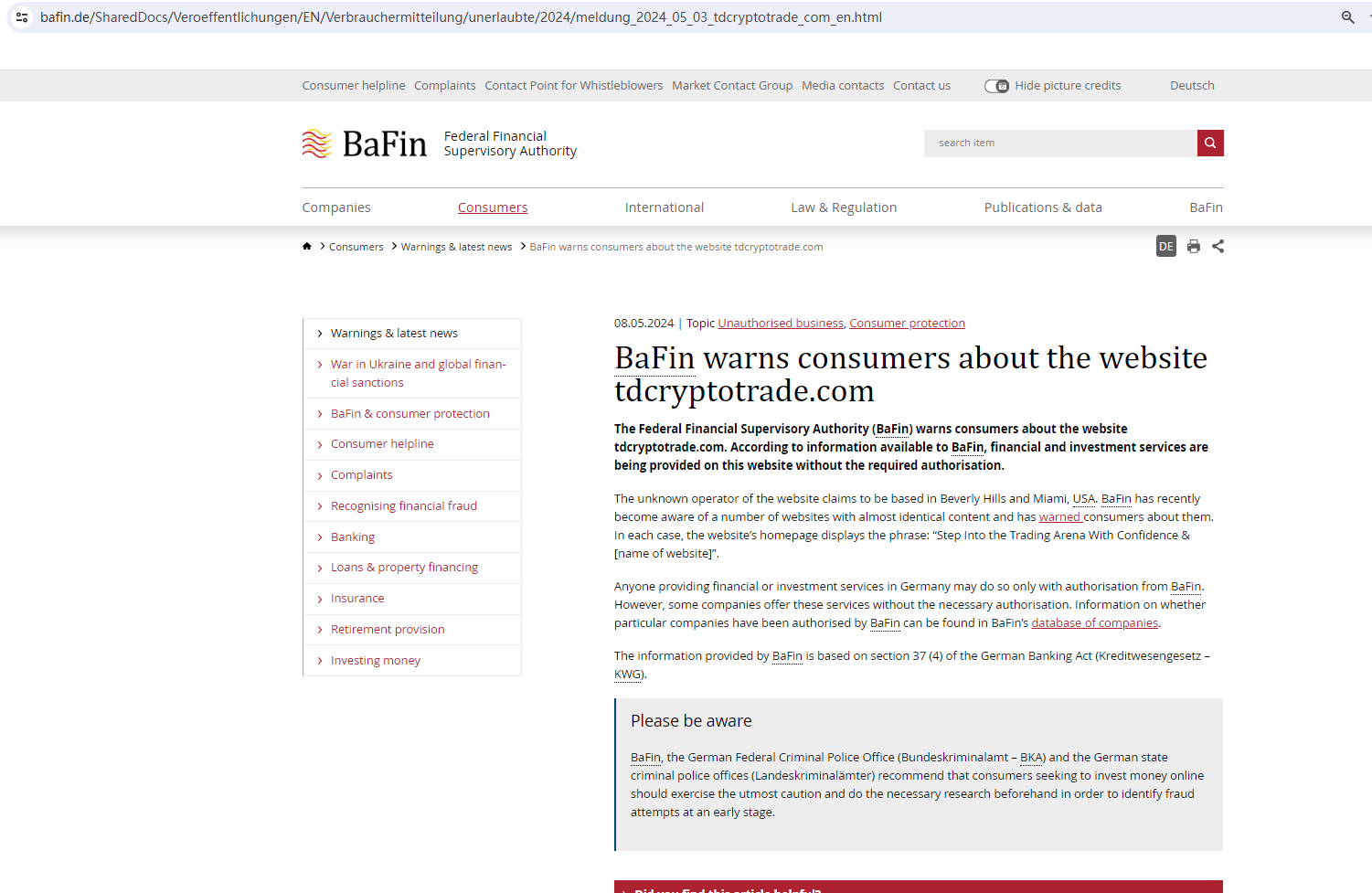 Furthermore, the Federal Financial Supervisory Authority (BaFin) warned consumers about the services offered on the website tdcryptotrade.com, saying the operator was providing financial and investment services on this website without the required authorization.