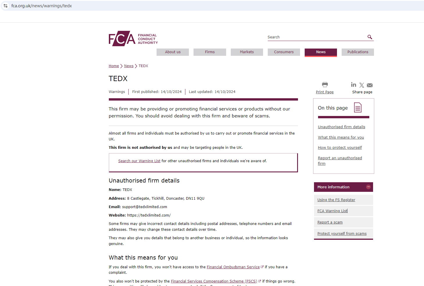 On October 14, 2024, the Financial Conduct Authority (FCA) issued a warning against TEDX, believing this company might be providing financial services or products without proper authorization in the UK. https://www.fca.org.uk/news/warnings/tedx