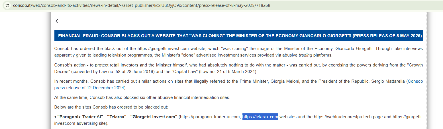 On May 8, 2025, the Italian Companies and Exchange Commission (CONSOB) has ordered Telarax's website to be blacked out since it offers financial services illegally. https://www.consob.it/web/consob-and-its-activities/news-in-detail/-/asset_publisher/kcxlUuOyjO9x/content/press-release-of-8-may-2025/718268