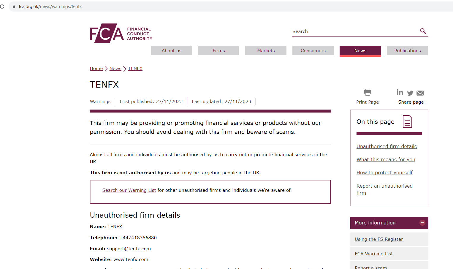 On 27 November 2023, the United Kingdom Financial Conduct Authority (UK FCA) issued a warning that TENFX was providing financial services or products in the UK without authorisation. You may visit: https://www.fca.org.uk/news/warnings/tenfx
