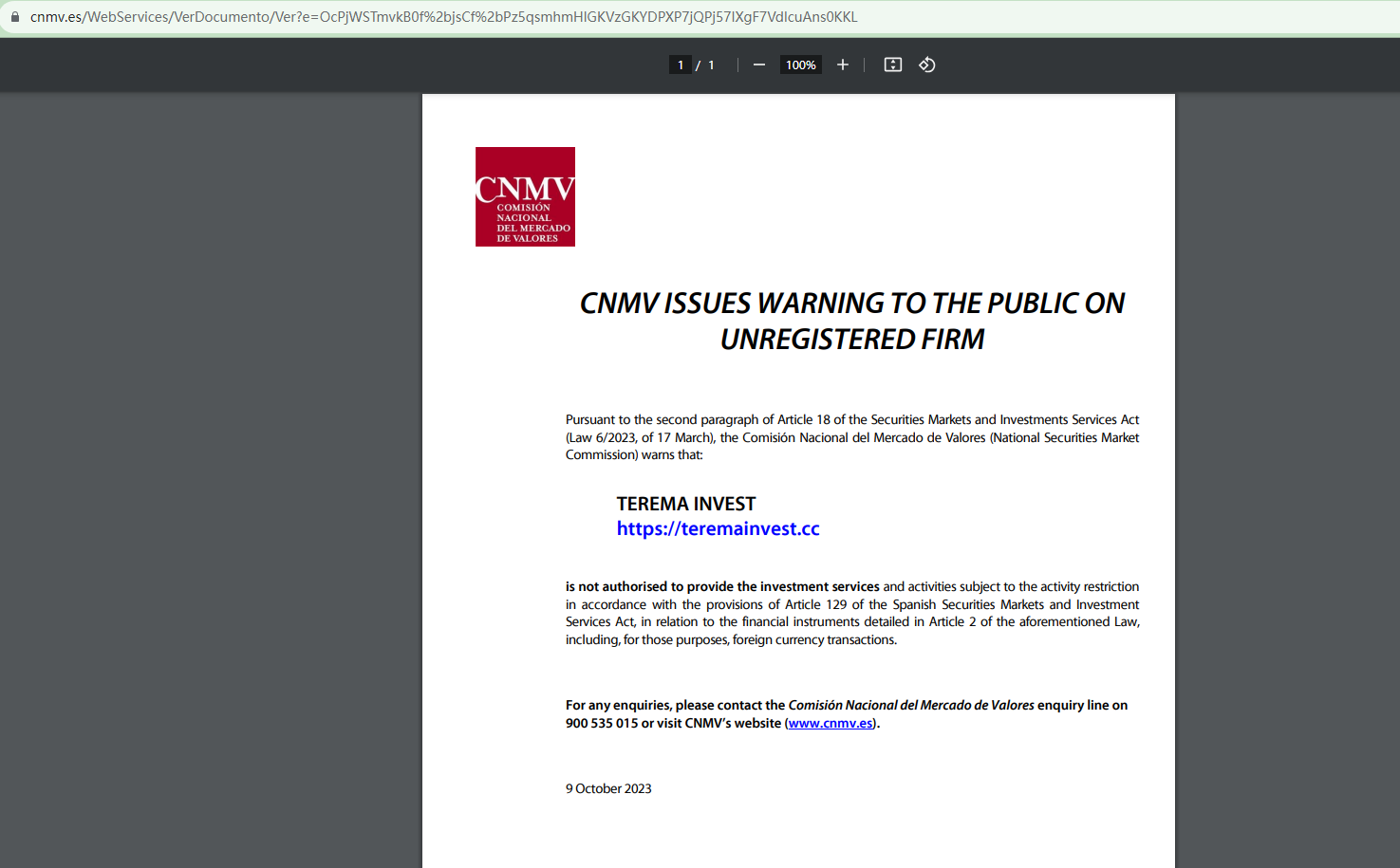 On October 9, 2023, the Comisión Nacional del Mercado de Valores (CNMV) added Terema Invest to its warning list for providing investment services without authorization. https://www.cnmv.es/Portal/ResultadoBusqueda.aspx?tipo=1&sortExpression=Fecha&sortDirection=1&page=1