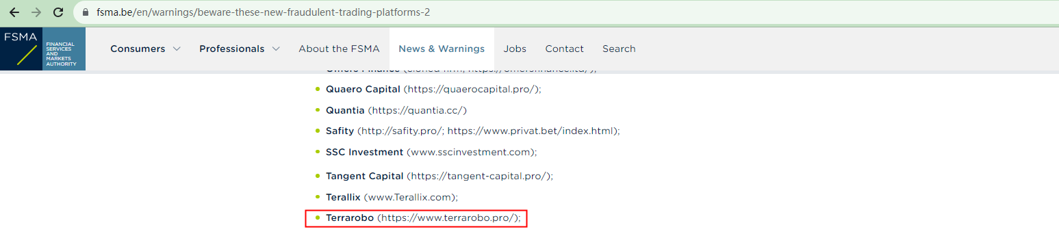 On November 30, 2023, the Belgian Financial Services and Markets Authority (FSMA) added Terrarobo to its warning list as a fraudulent trading platform operating in the Belgian market. https://www.fsma.be/en/warnings/beware-these-new-fraudulent-trading-platforms-2