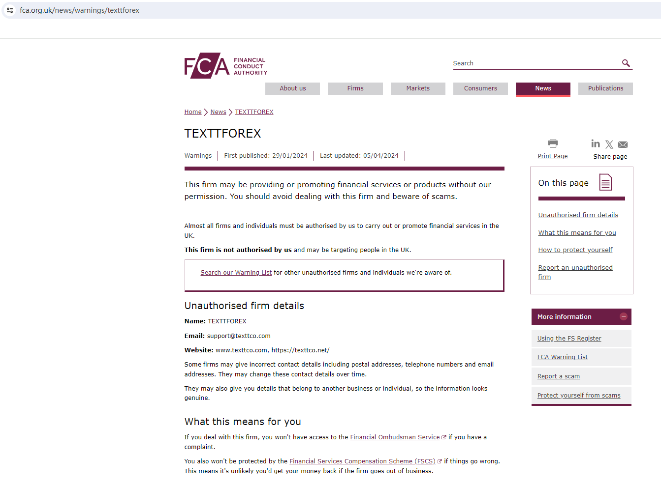 On April 5, 2024, the Financial Conduct Authority (FCA) issued a warning against TEXTTFOREX, believing this company might be providing financial services or products without proper authorization in the UK. https://www.fca.org.uk/news/warnings/texttforex