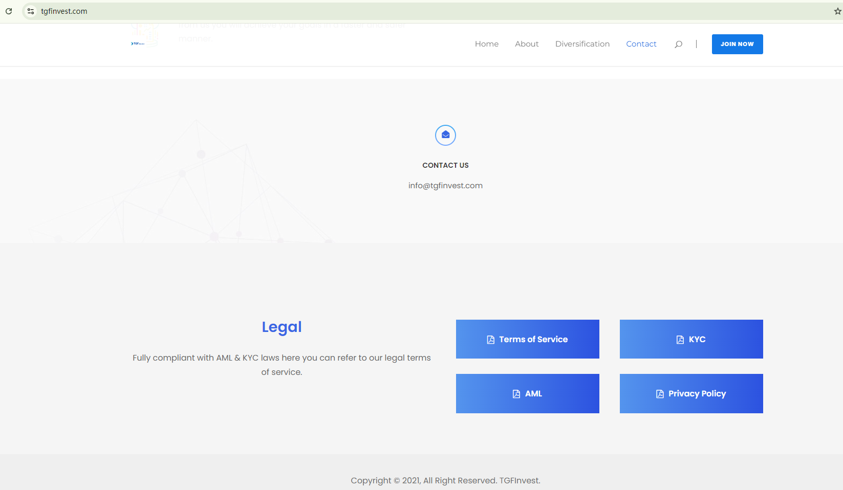 The website for TGFInvest is very simple, without providing the necessary company information and the required licensing details. This lack of essential information is a scam indicator.