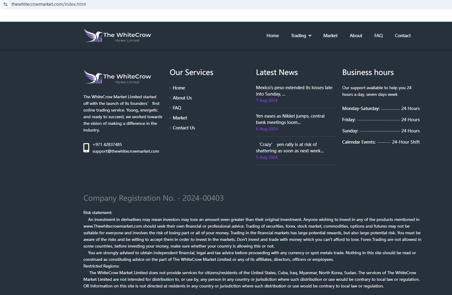 In essence, The WhiteCrow Market is not regulated by any governing body. Entrusting it with investors' funds is highly risky, as there are no legal protections in place to safeguard the funds.