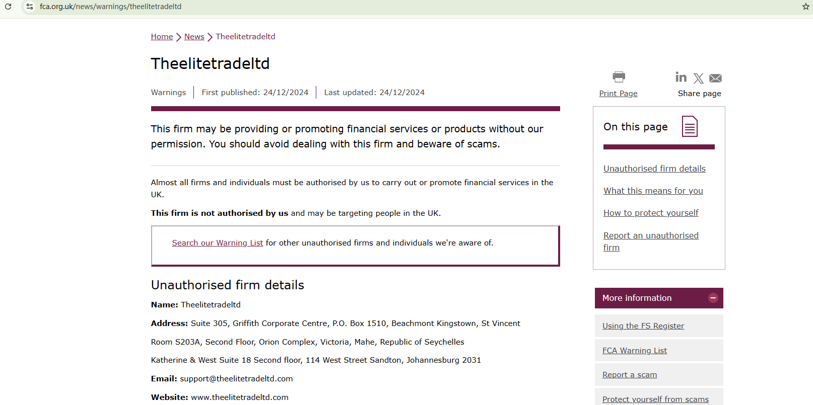 On December 24, 2024, the Financial Conduct Authority (FCA) issued a warning against Theelitetradeltd, believing this company might be providing financial services or products without proper authorization in the UK. https://www.fca.org.uk/news/warnings/theelitetradeltd