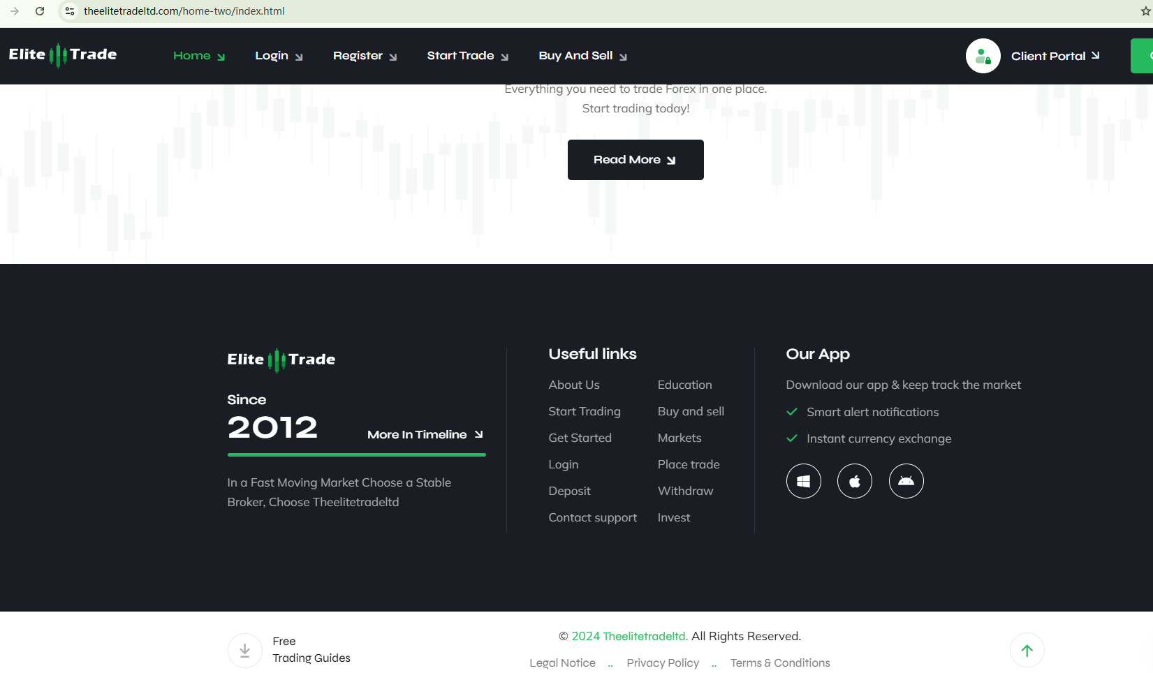 Theelitetradeltd doesn't provide any valid details about its true identity, making itself untraceable in the event of issues. Contradictory to its claim of having started business since 2012, its domain name was just registered in March 2024. The Financial Conduct Authority (FCA) has issued a warning against Theelitetradeltd for the lack of the required authorization.