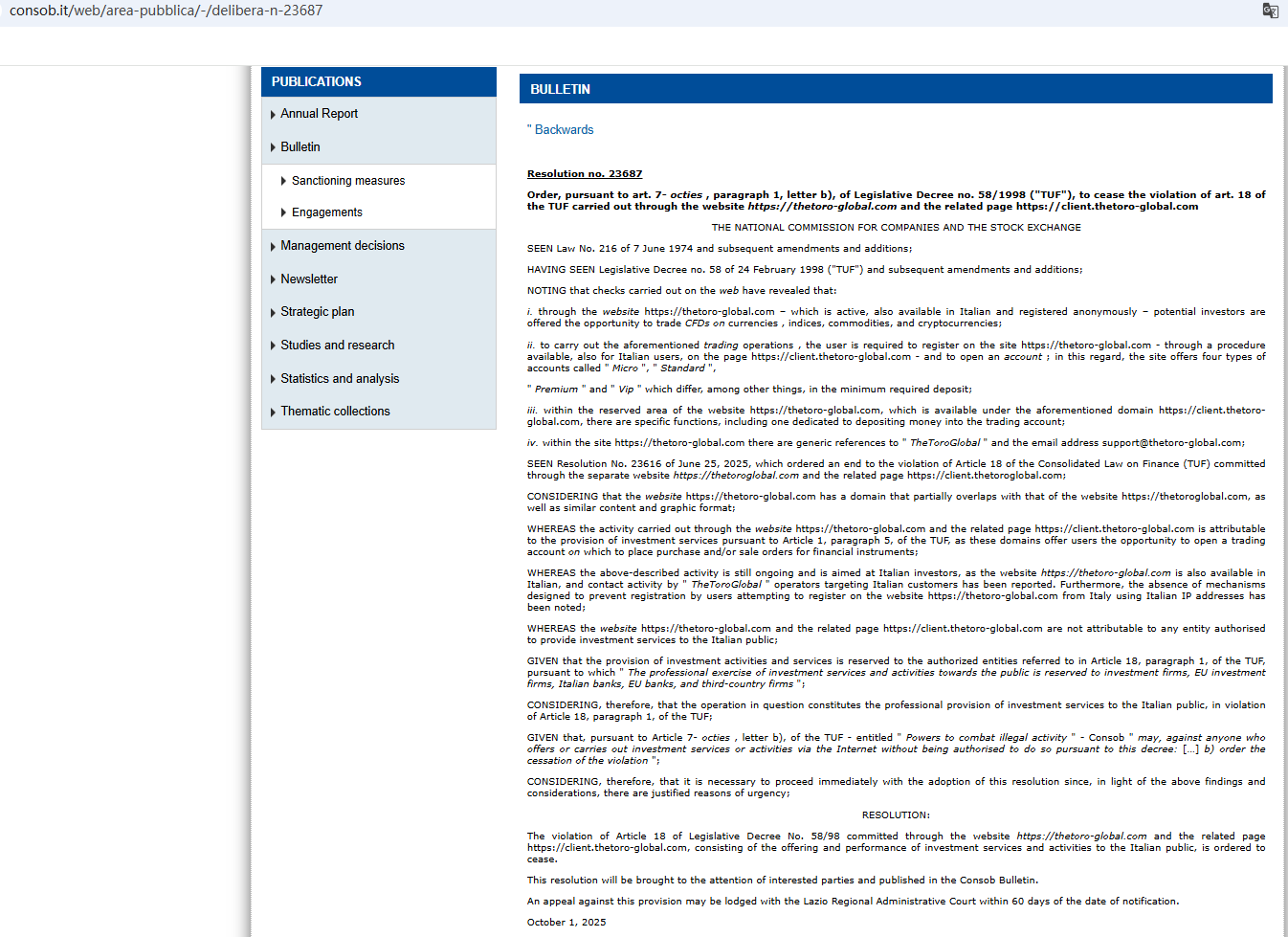 On Oct 1, 2025, the Italian Companies and Exchange Commission (CONSOB) ordered Thetoroglobal to be blacked out since it offers financial services illegally in Italy. https://www.consob.it/web/area-pubblica/-/delibera-n-23687