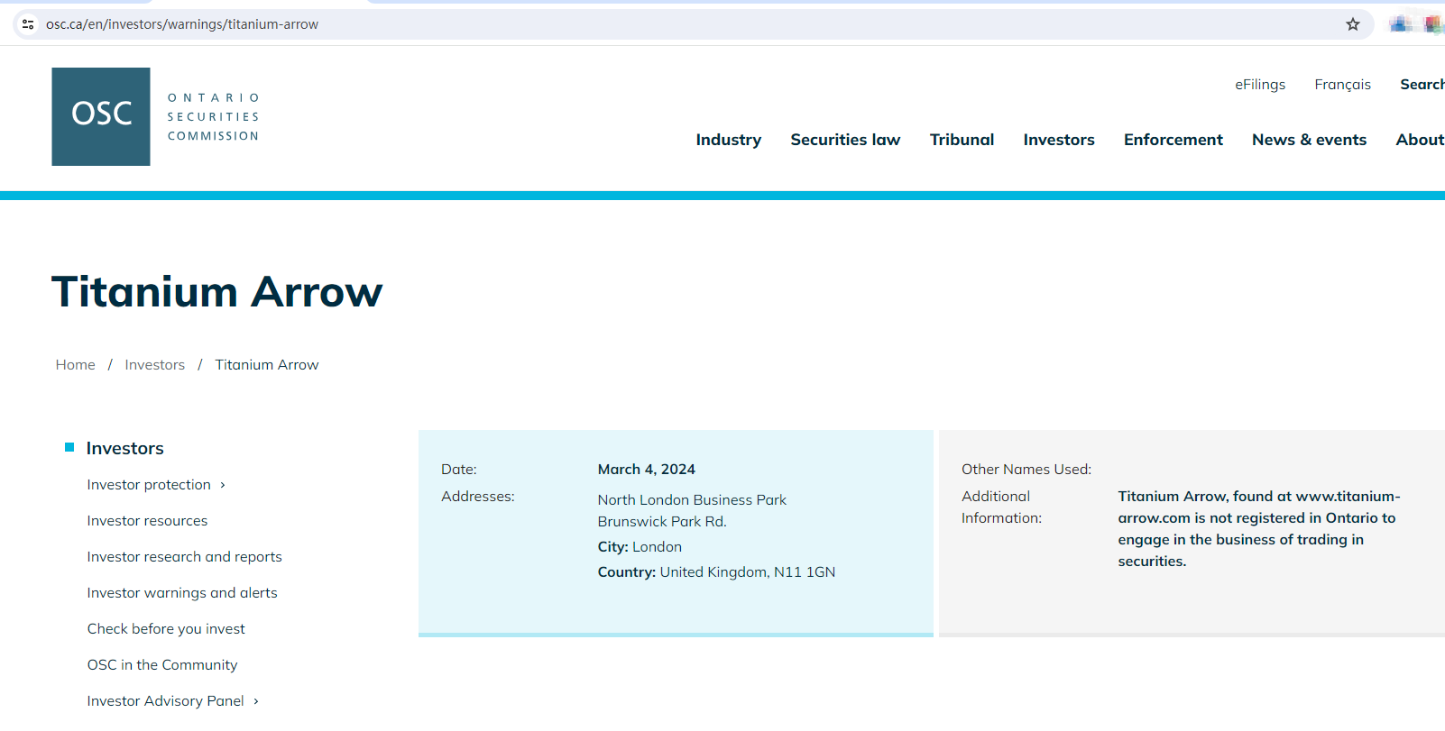 On 4 March 2024, the Ontario Securities Commission (OSC) issued a warning that Titanium Arrow was providing financial services or products without authorisation. You may visit: https://www.osc.ca/en/investors/warnings/titanium-arrow