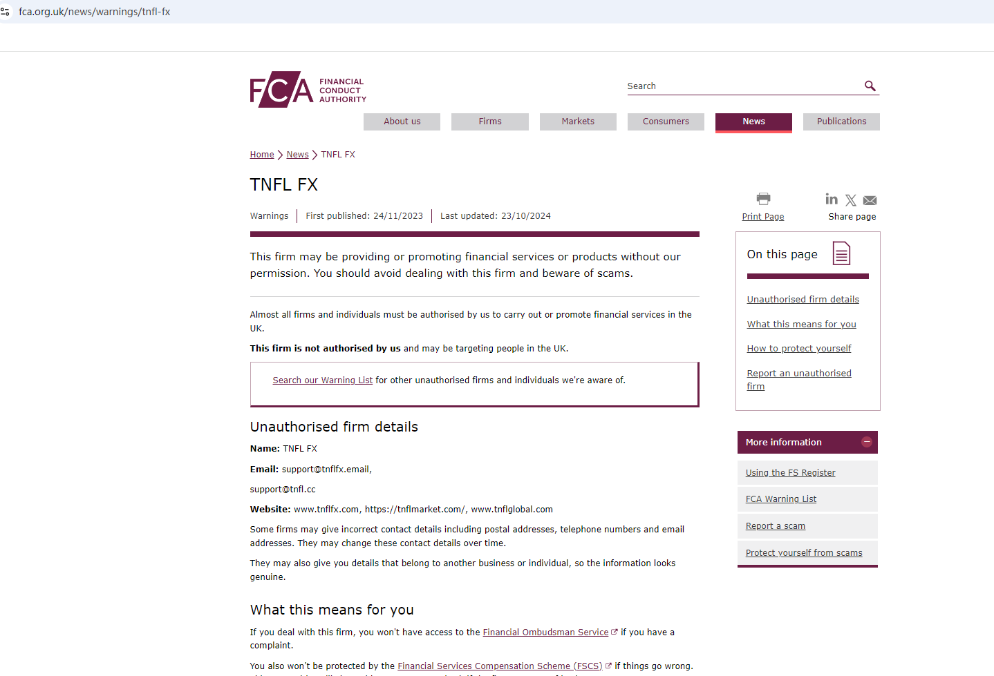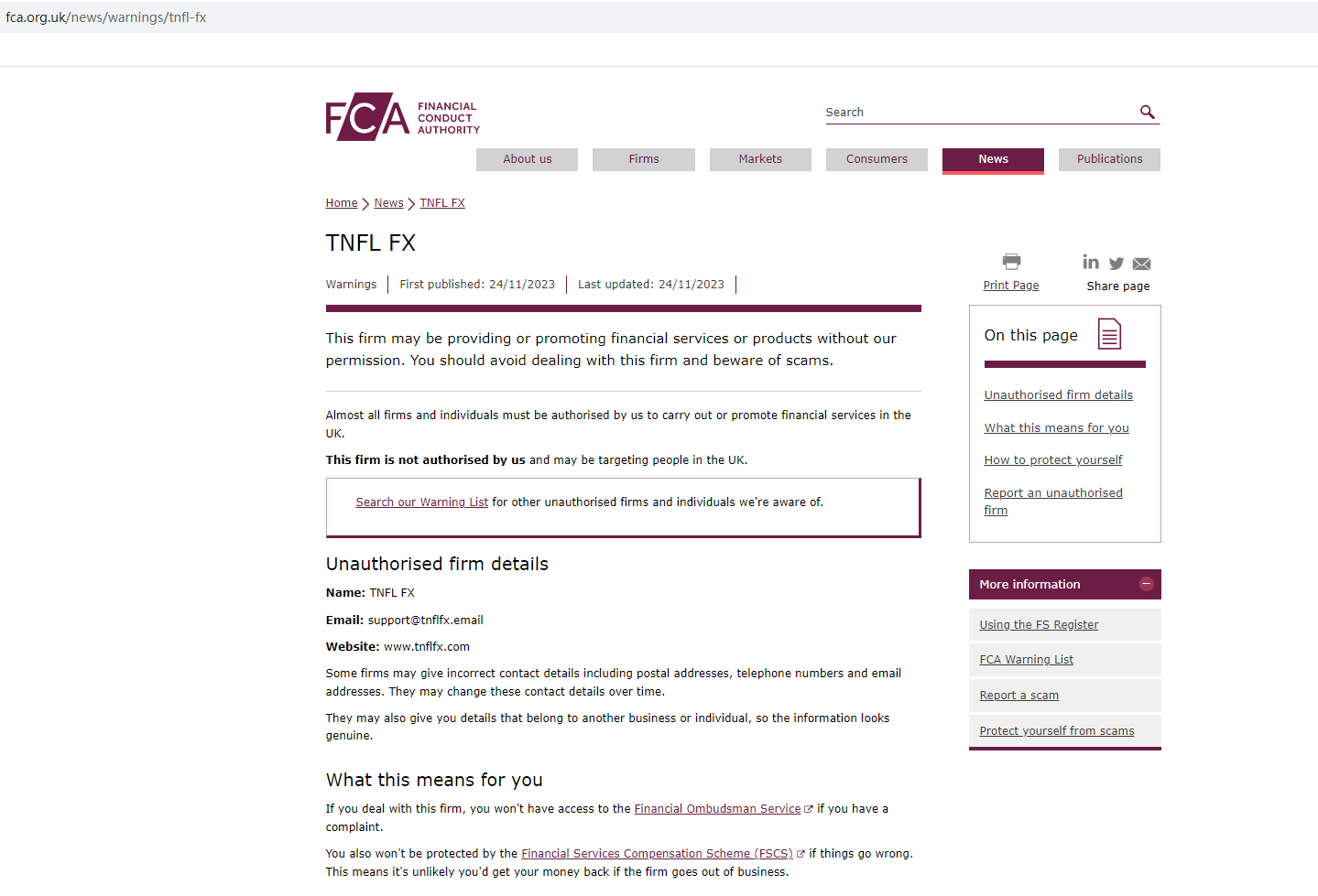 On 24 November 2023, the United Kingdom Financial Conduct Authority (UK FCA) issued a warning that TNFL FX was providing financial services or products in the UK without authorisation. You may visit: https://www.fca.org.uk/news/warnings/tnfl-fx