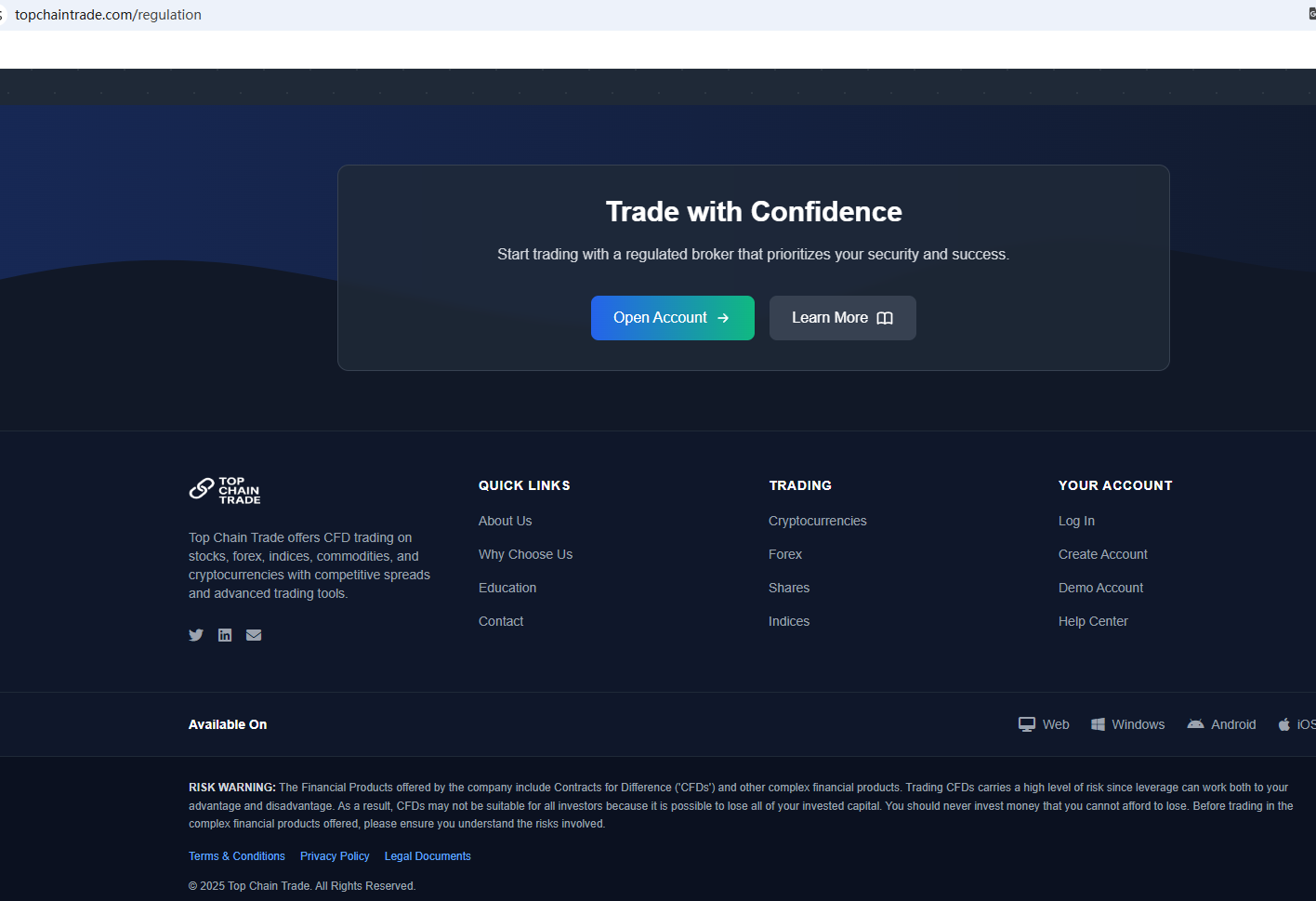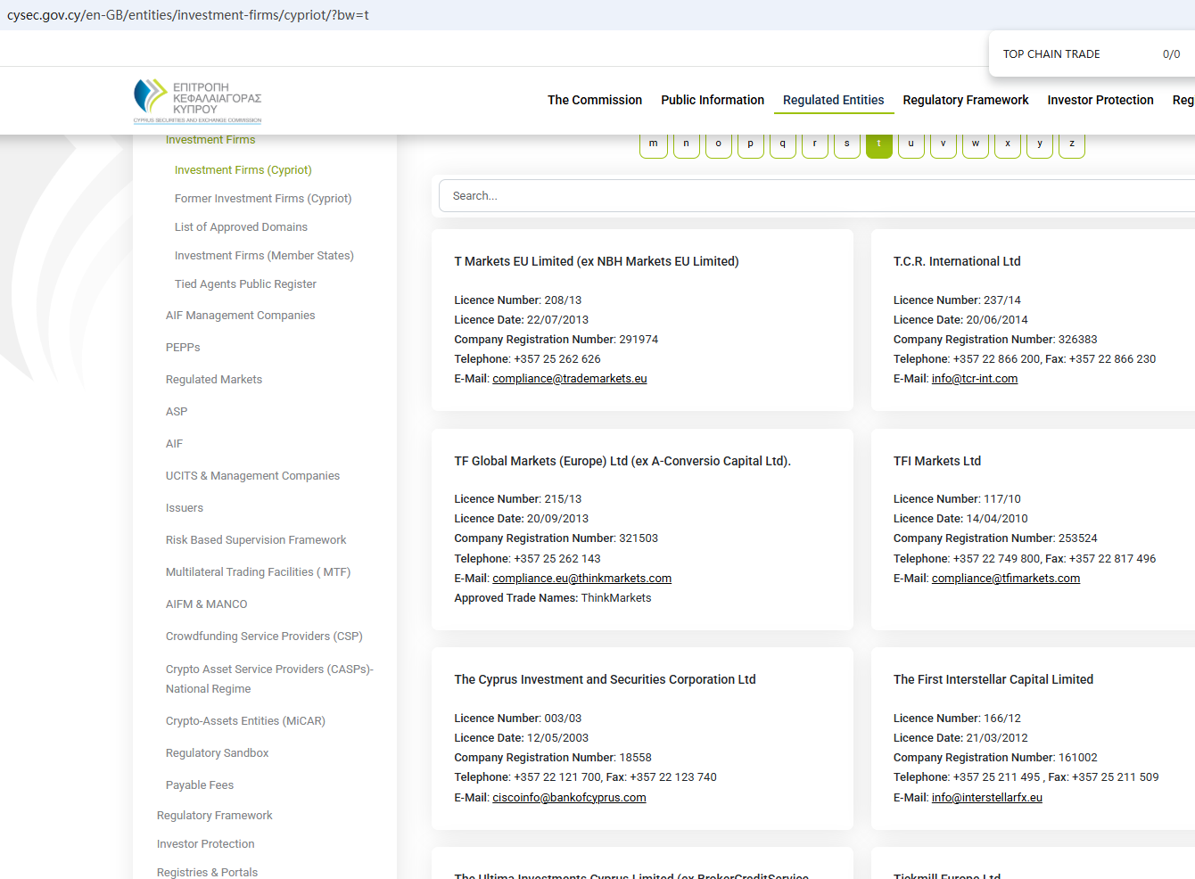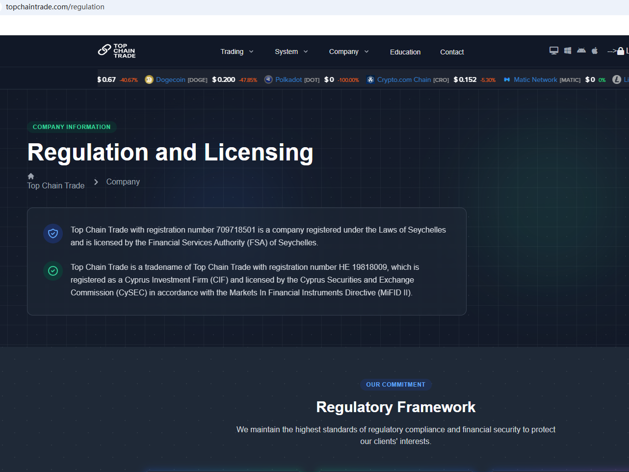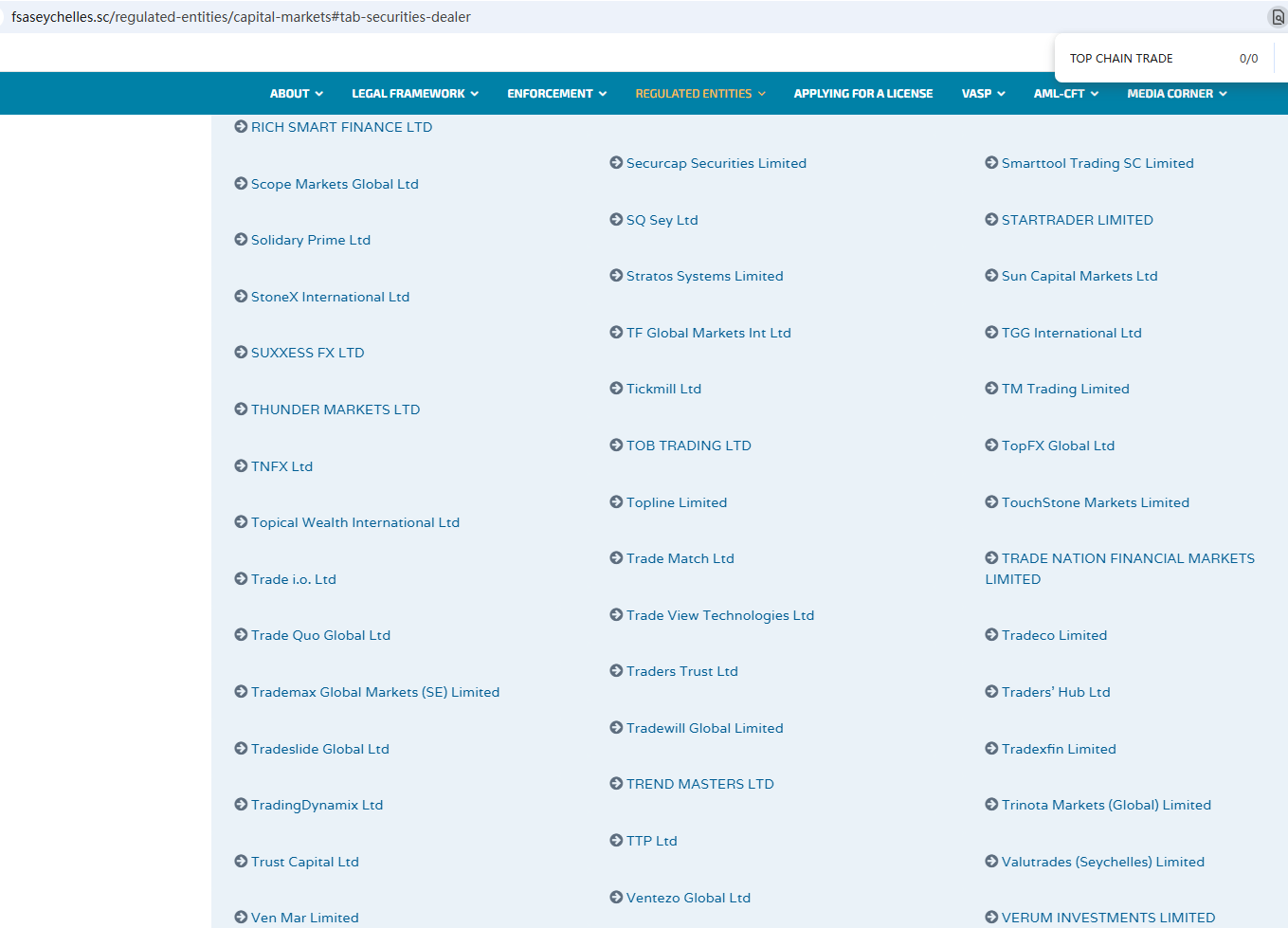 According to its website, it claims to be regulated by the Seychelles Financial Services Authority (Seychelles FSA) and the Cyprus Securities and Exchange Commission (CySEC). Upon investigation, no matching information was found in the Seychelles FSA and CySEC. In addition, the Financial Conduct Authority (FCA) issued a warning regarding TOP CHAIN TRADE, suspecting that this company may be offering financial services or products without the necessary authorization.