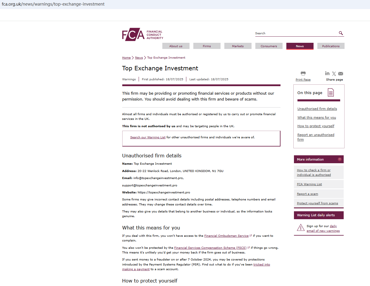 On July 18, 2025, the Financial Conduct Authority (FCA) issued a warning against Top Exchange Investment, believing this company might be providing financial services or products without proper authorization in the UK. https://www.fca.org.uk/news/warnings/top-exchange-investment