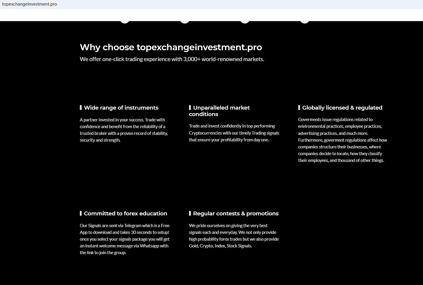 In essence, Top Exchange Investment is not regulated by any governing body. Entrusting it with investors' funds is highly risky, as there are no legal protections in place to safeguard the funds. Top Exchange Investment appears to be a scam.