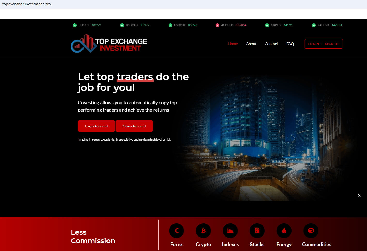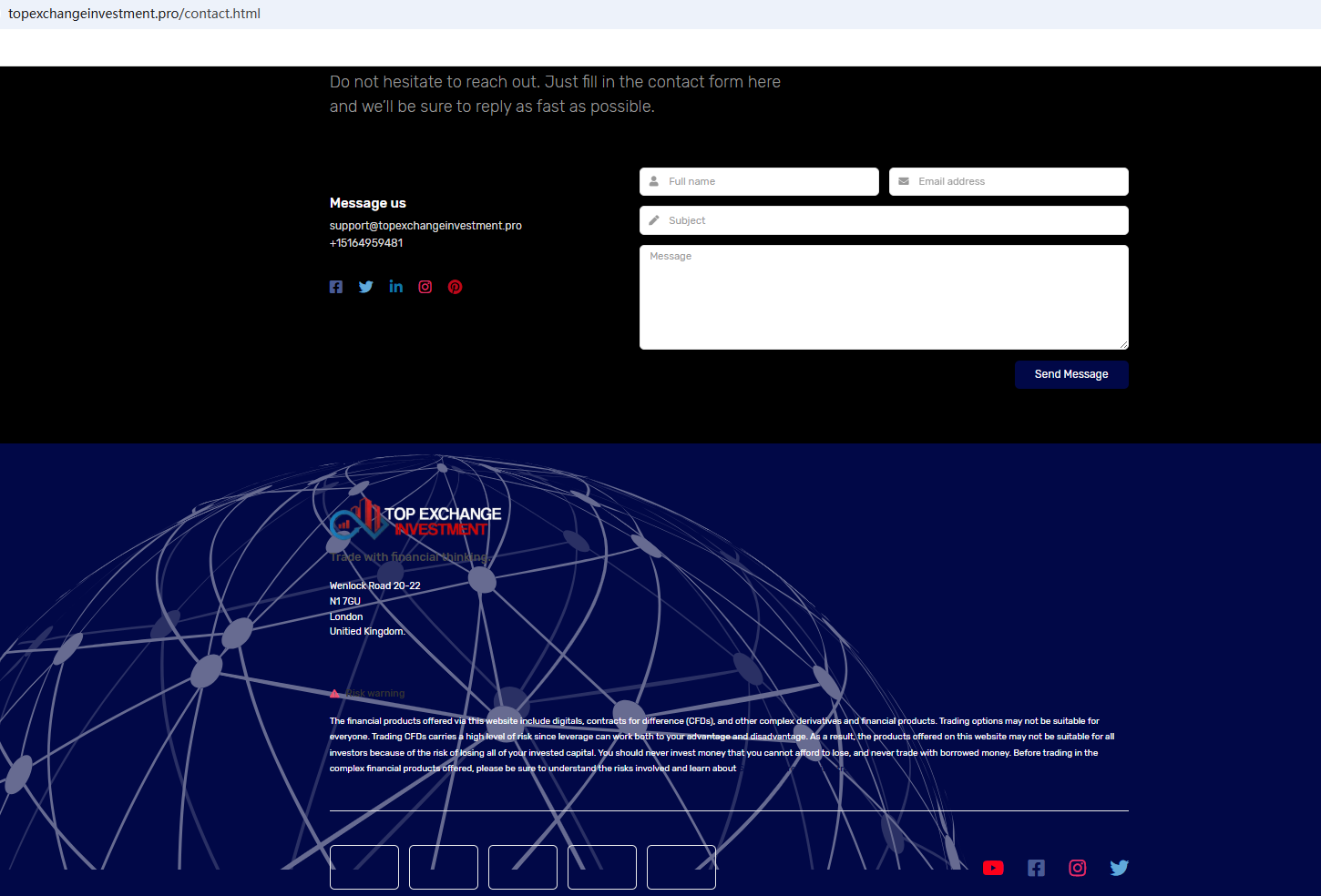 This company uses a common template for scam websites and has been flagged by Brokersview many times before. Such websites usually have similar web design and wording. The company is located in the UK, and we found that the Financial Conduct Authority (FCA) issued a warning against Top Exchange Investment, believing this company might be providing financial services or products without proper authorization in the UK.