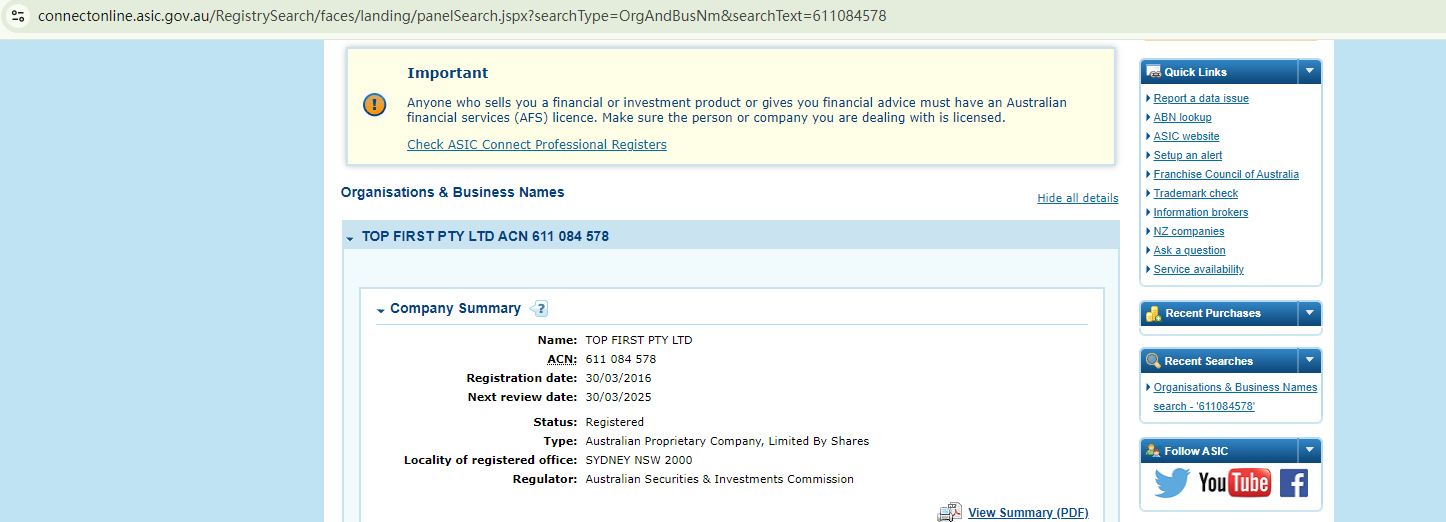 According to its website, it provides a registration number, and after searching, it was indeed found. However, if you want to exercise foreign exchange rights in Australia, you must obtain permission from Australia Securities & Investment Commission (ASIC). Upon investigation, no matching information was found in ASIC.
