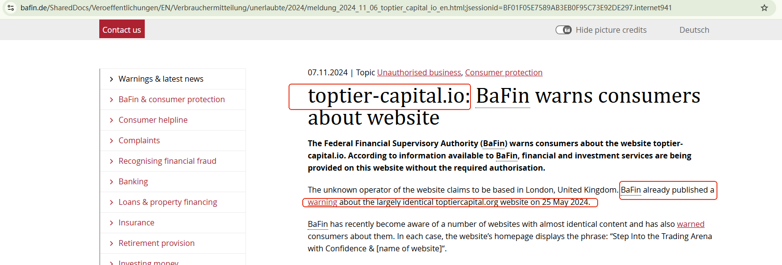 On November 7, 2024, the Federal Financial Supervisory Authority (BaFin) issued a warning against TopTier Capital for the lack of the required authorization. BaFin has disclosed two web addresses of TopTier Capital to alert investors to the scam: toptier-capital.io and toptiercapital.org. https://www.bafin.de/SharedDocs/Veroeffentlichungen/EN/Verbrauchermitteilung/unerlaubte/2024/meldung_2024_11_06_toptier_capital_io_en.html