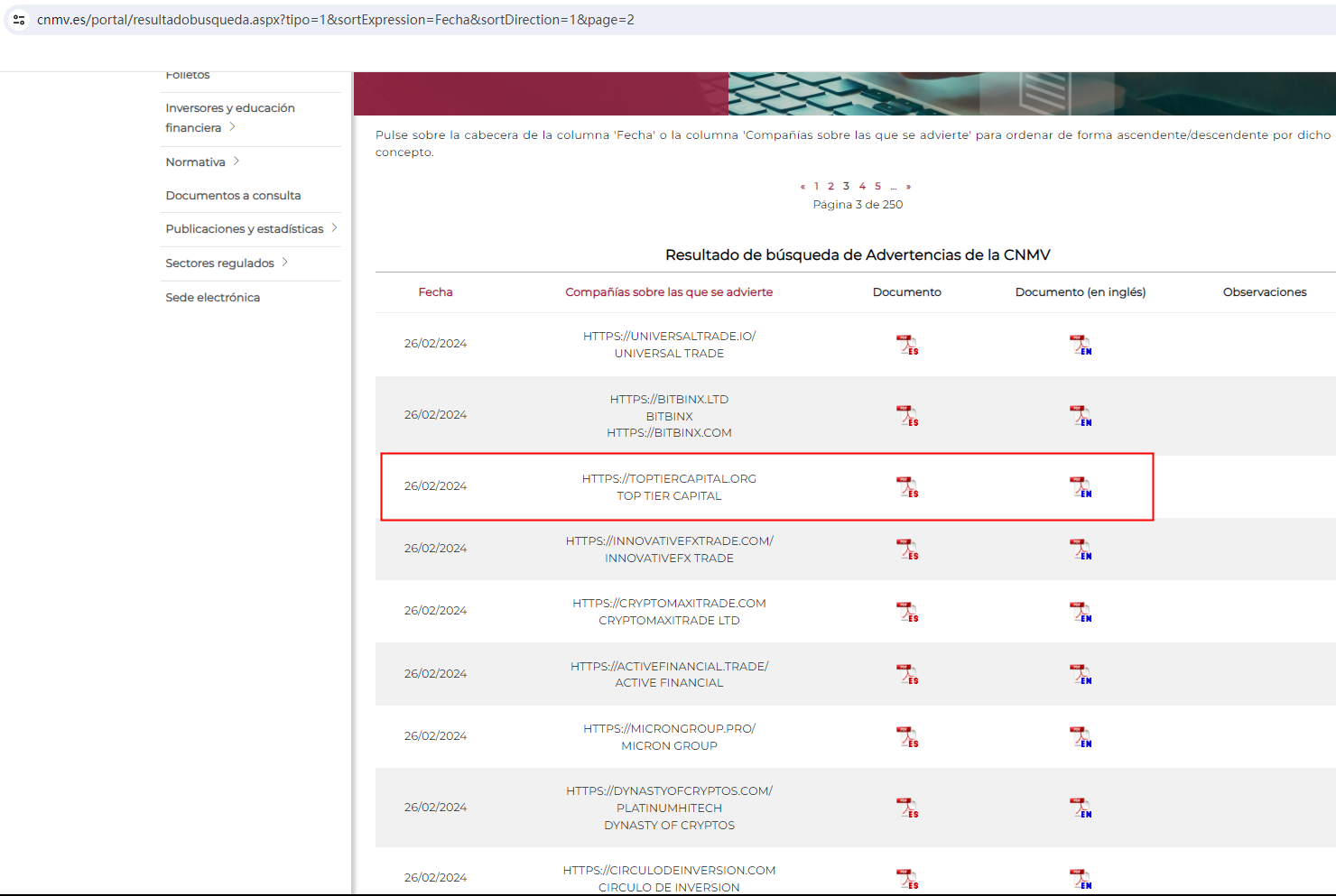 In addition, the Comisión Nacional del Mercado de Valores (CNMV) added TopTier Capital to its warning list for providing investment services without authorization.