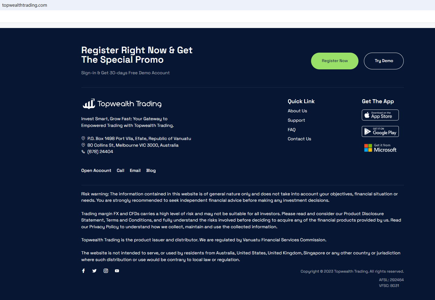 According to its website, it claims to be based in Australia and Vanuatu and is regulated by the Vanuatu Financial Services Commission (VFSC). Upon investigation, no matching information was found in the Australia Securities & Investment Commission (ASIC) and VFSC.