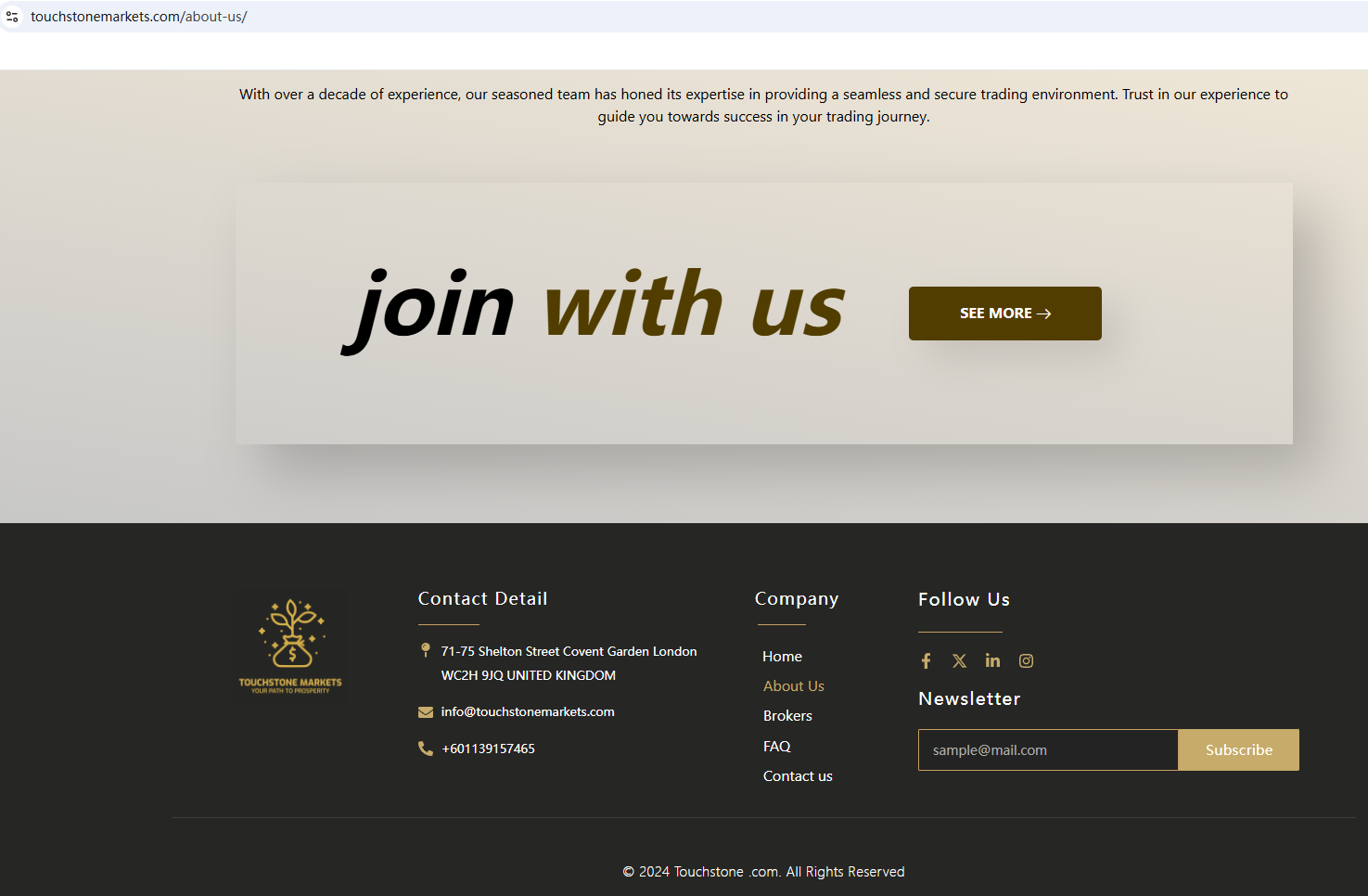 According to its website, Touchstone Markets is located in the UK. Upon investigation, we found that the Financial Conduct Authority (FCA) issued a warning against it, believing this company might be providing financial services or products without proper authorization in the UK.