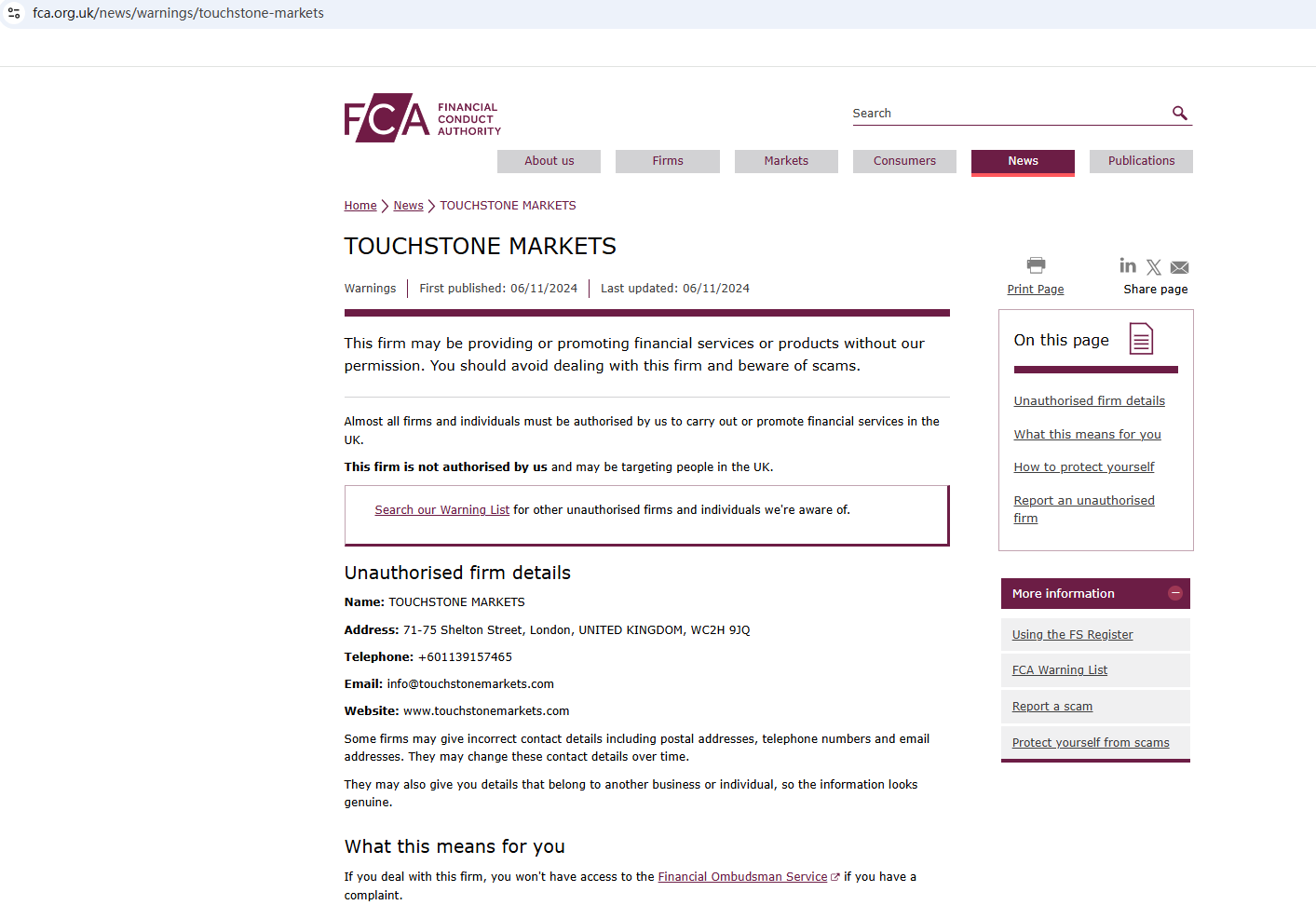On November 6, 2024, the Financial Conduct Authority (FCA) issued a warning against Touchstone Markets, believing this company might be providing financial services or products without proper authorization in the UK. https://www.fca.org.uk/news/warnings/touchstone-markets