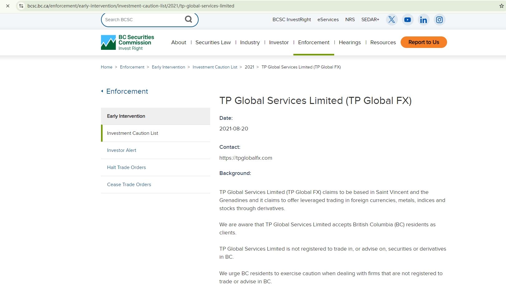 On August 20, 2021, the British Columbia Securities Commission (BCSC) issued a warning against TP Global FX, stating that this broker is not registered to trade in, or advise on, securities or derivatives in BC. https://www.bcsc.bc.ca/enforcement/early-intervention/investment-caution-list/2021/tp-global-services-limited