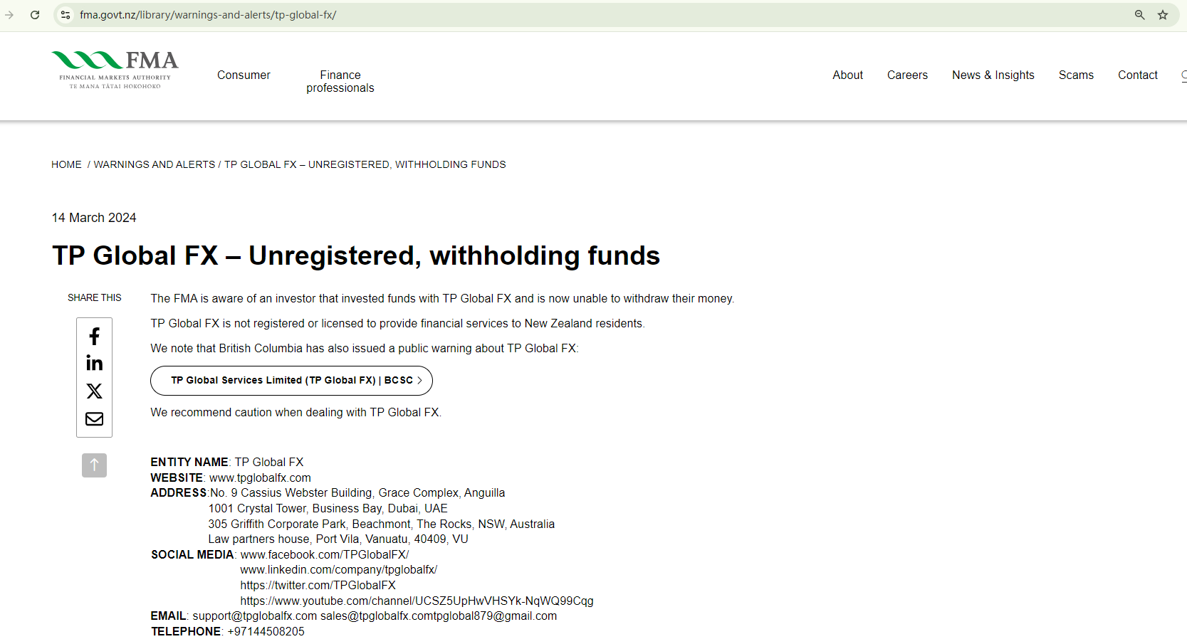 On April 14, 2024, the New Zealand Financial Markets Authority (FMA) issued a warning against TP Global FX, noting that the company is not registered or licensed to provide financial services to New Zealand residents. https://www.fma.govt.nz/library/warnings-and-alerts/tp-global-fx/
