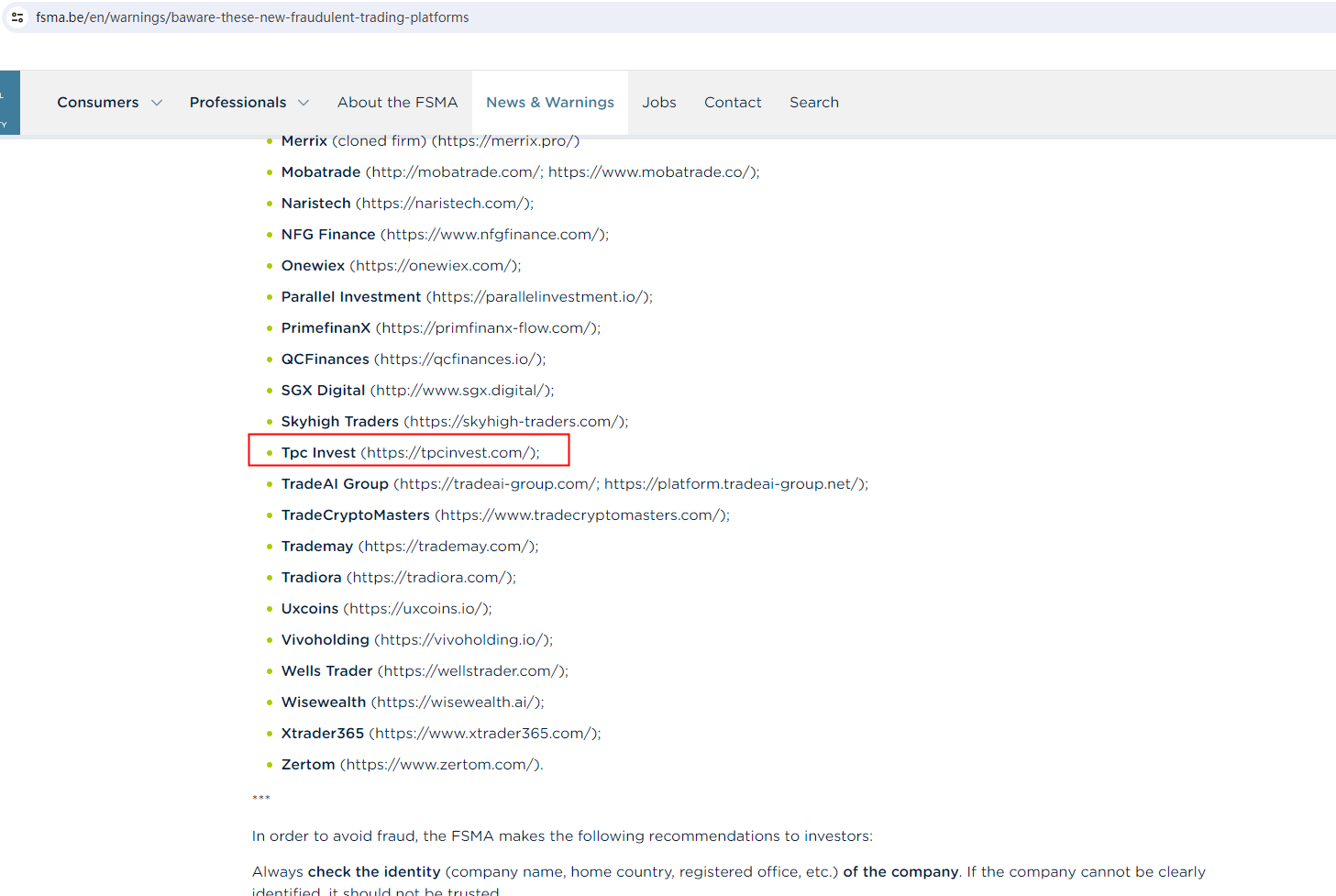 In addition, the Belgian Financial Services and Markets Authority (FSMA) added Tpc Invest to its warning list as a fraudulent trading platform.