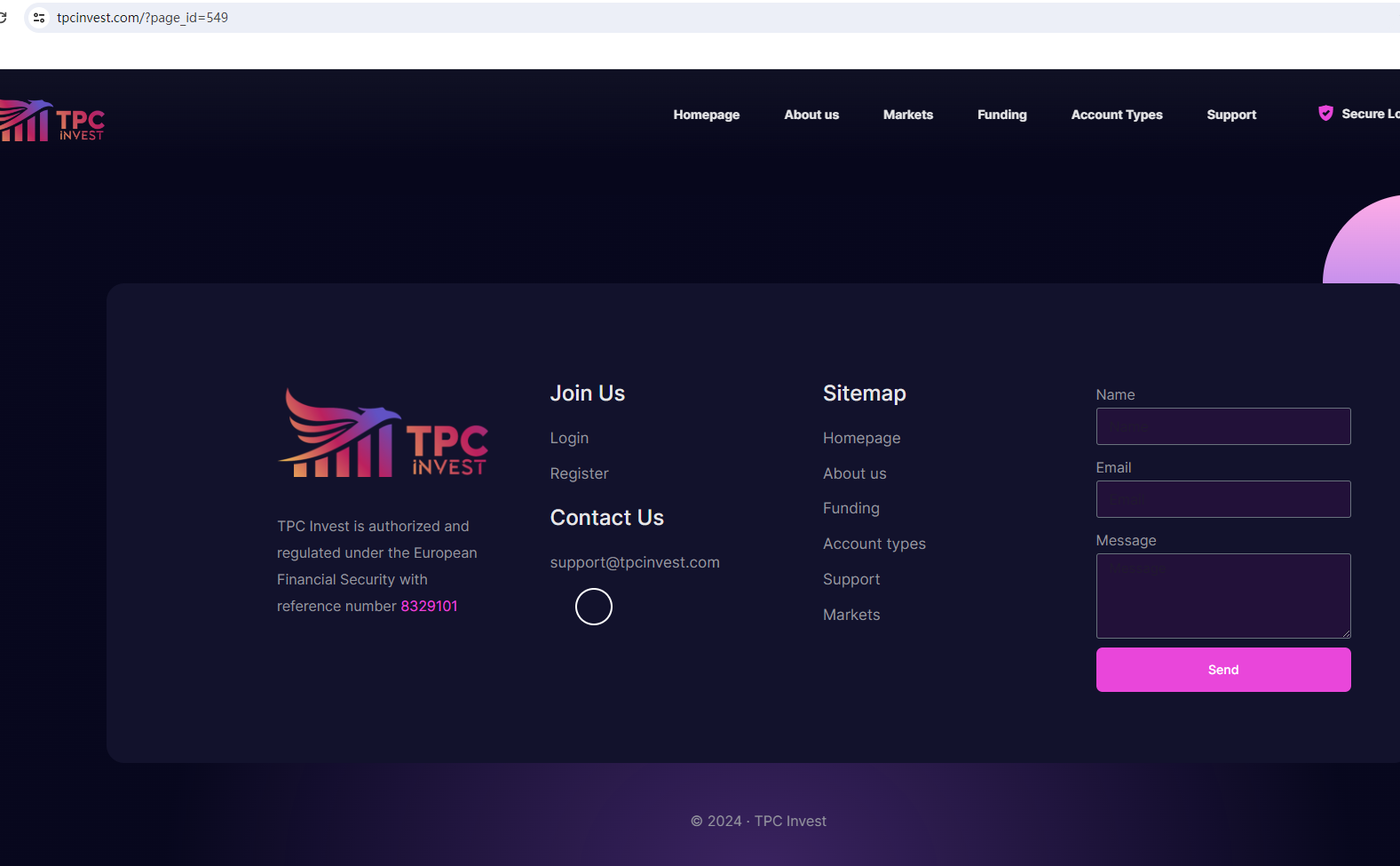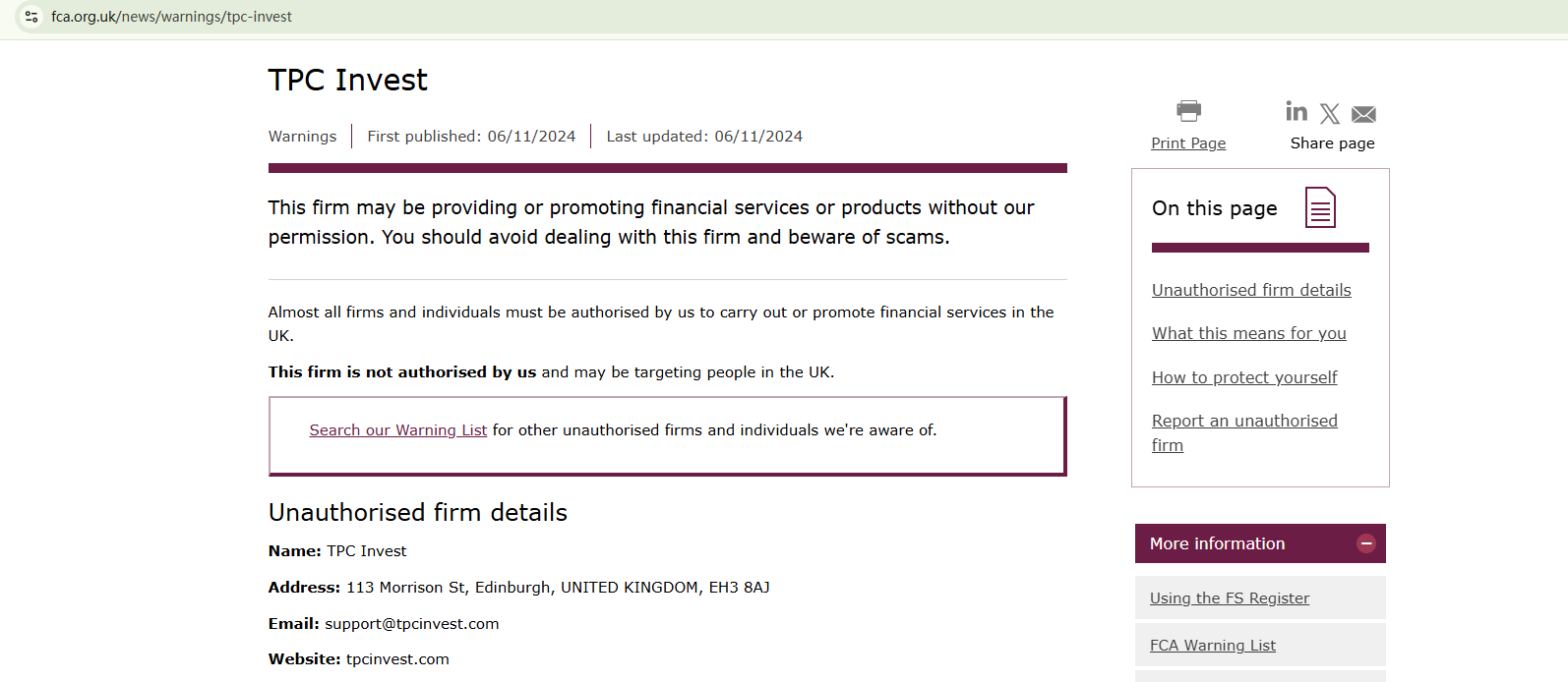 On November 6, 2024, the Financial Conduct Authority (FCA) issued a warning against Tpc Invest, believing this company might be providing financial services or products without proper authorization in the UK. https://www.fca.org.uk/news/warnings/tpc-invest