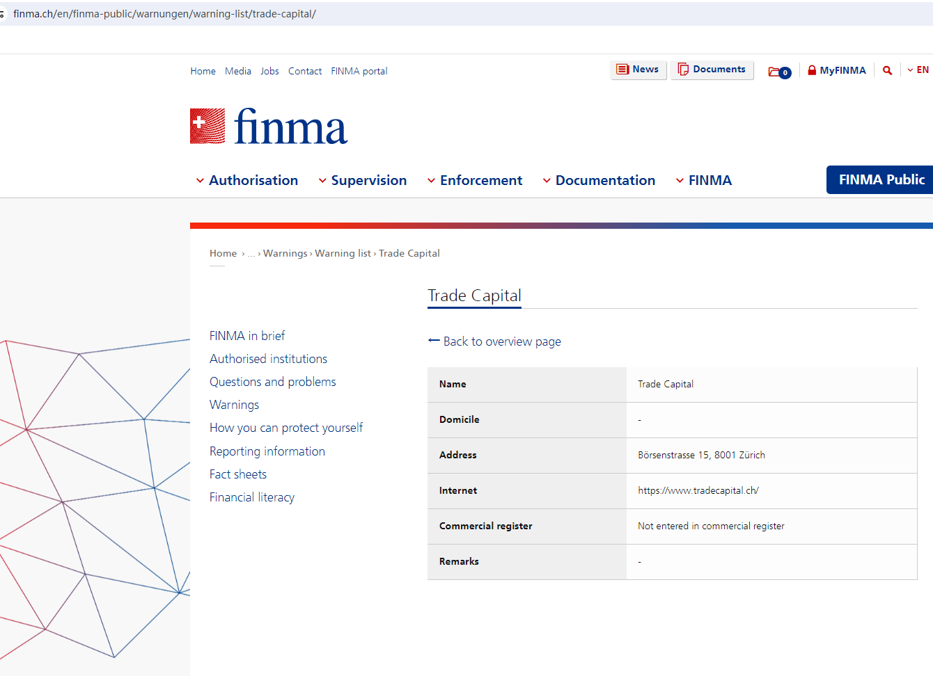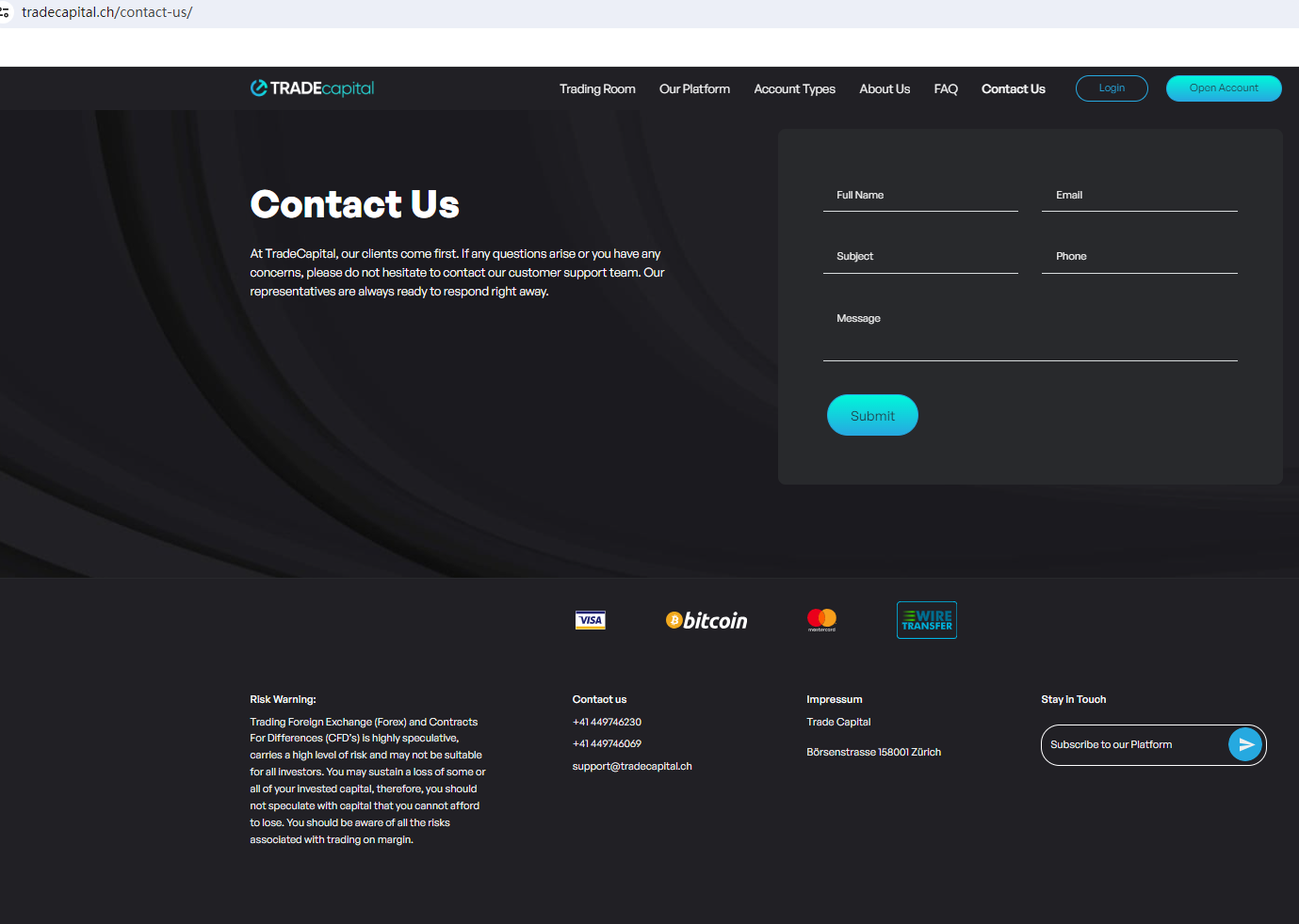 According to its website, it is located in the Zürich. Upon investigation, we found that the Swiss Financial Market Supervisory Authority (FINMA) warned against Trade Capital, believing this company might be providing financial services or products without proper authorization in Switzerland.