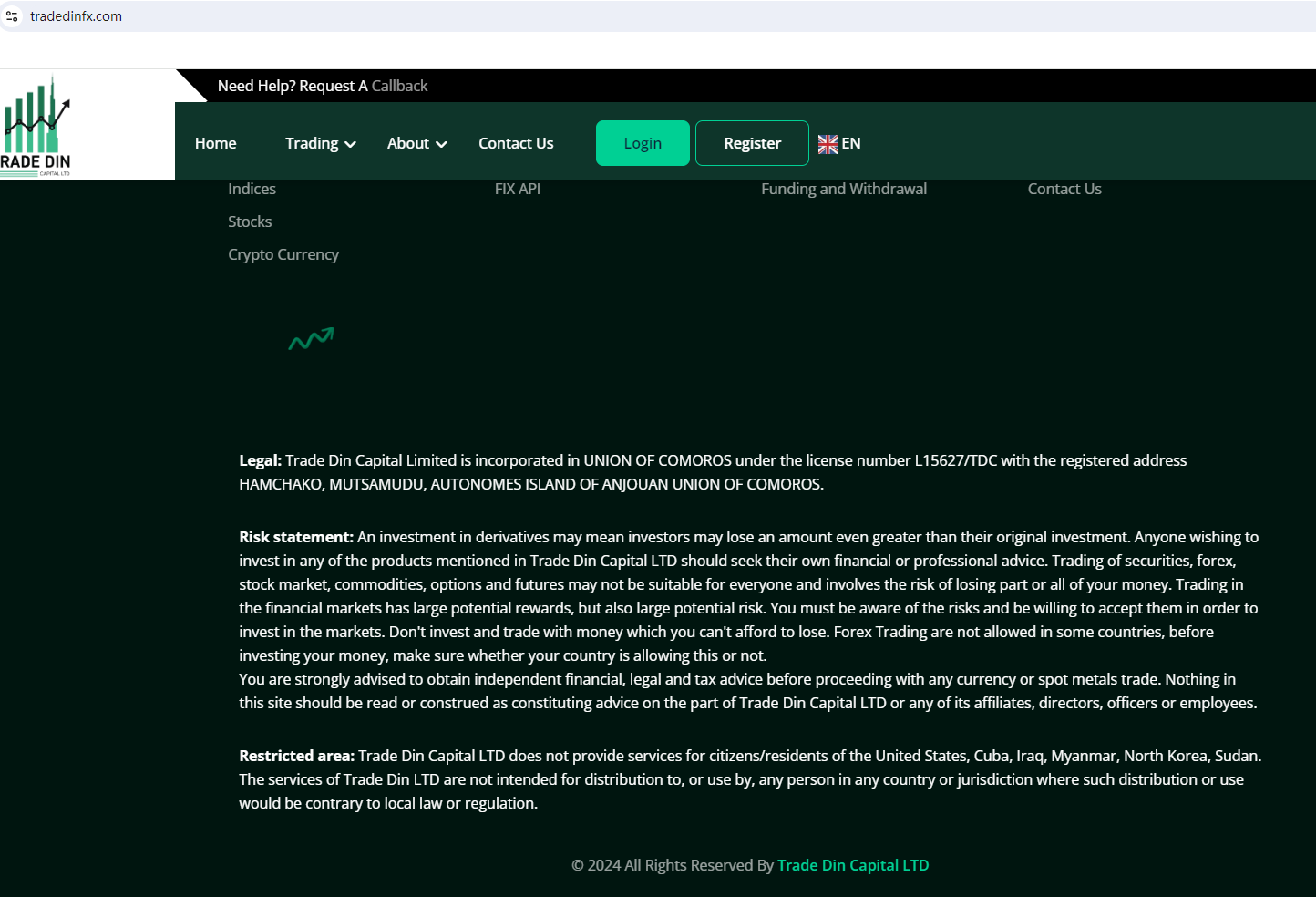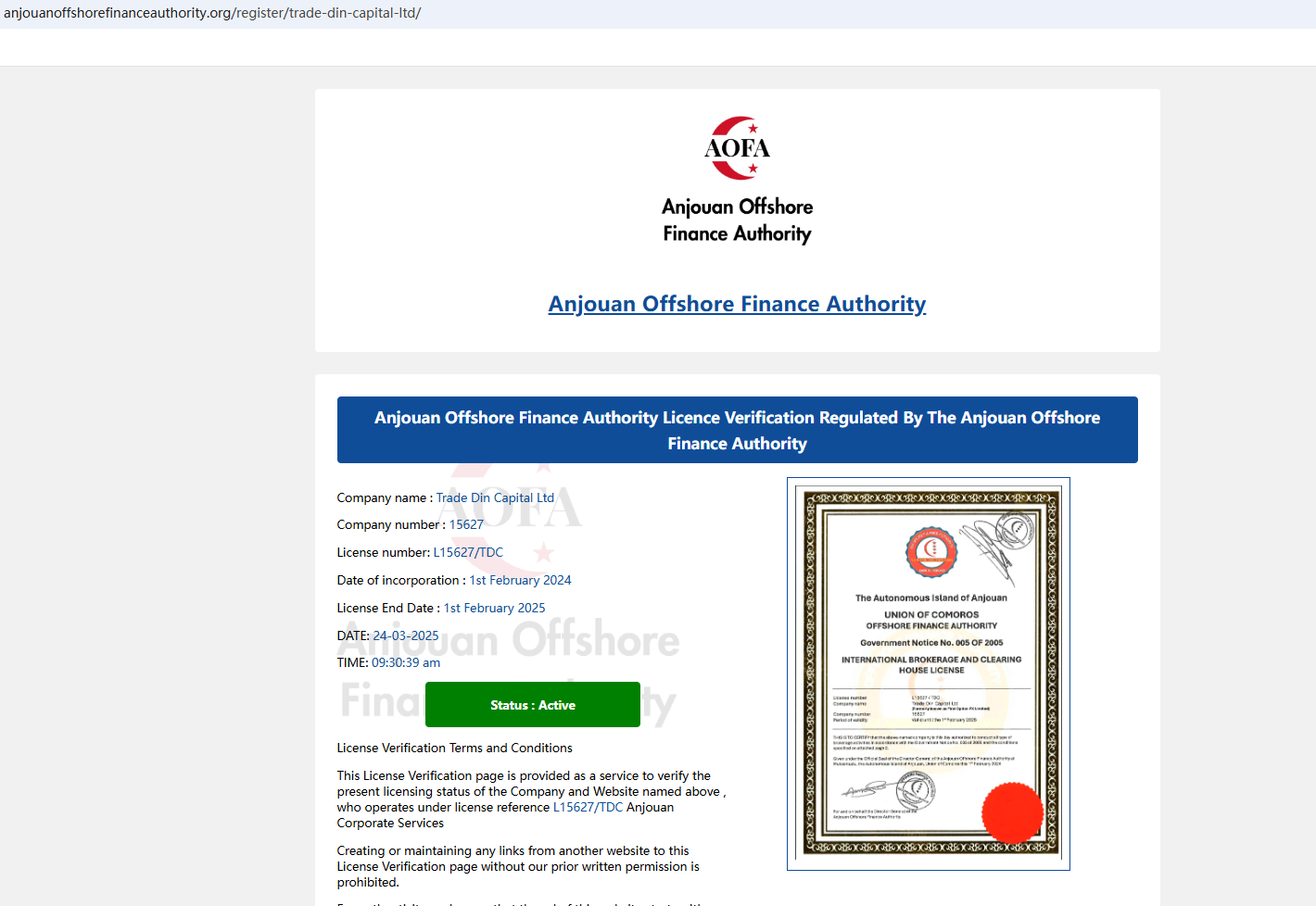 We have found that Trade Din FX's website is currently inaccessible, and it has been confirmed that its license issued by the Anjouan Offshore Financial Authority (AOFA) will expire on February 1, 2025. Based on the available evidence, we believe that Trade Din FX may be a scam, and investors are advised to pay attention to this situation and pay close attention.