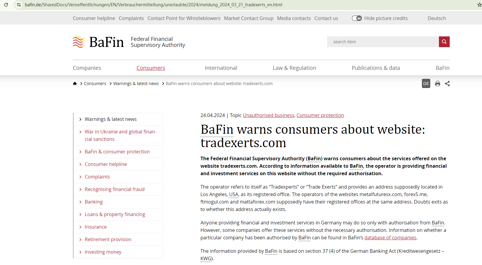 On 24 April, 2024, the Federal Financial Supervisory Authority (BaFin) warned consumers about the services offered on the website tradexerts.com, suspecting the operator of providing financial and investment services on this website without the required authorization. https://www.bafin.de/SharedDocs/Veroeffentlichungen/EN/Verbrauchermitteilung/unerlaubte/2024/meldung_2024_03_21_tradexerts_en.html
