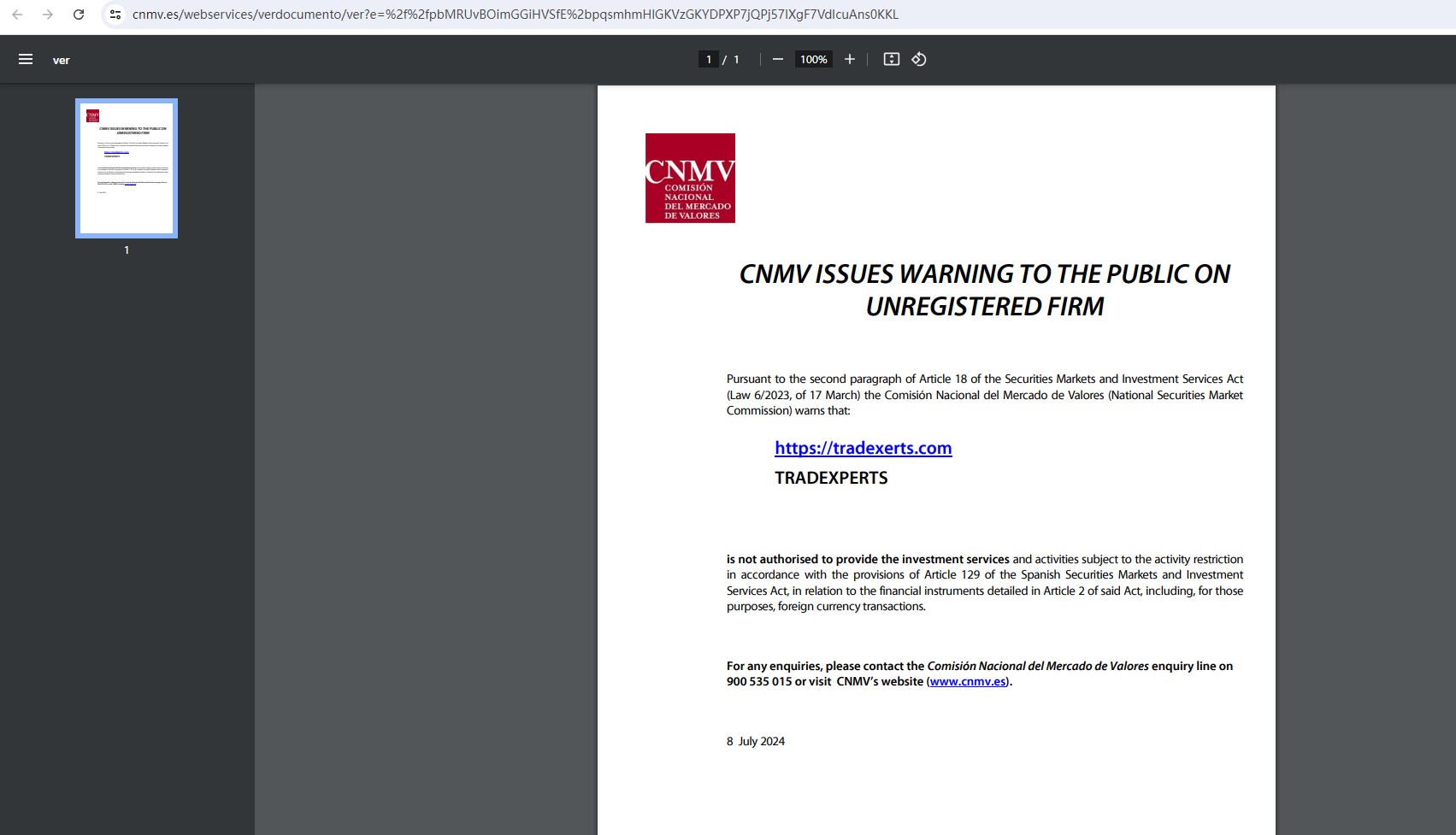 On July 8, 2024, the Comisión Nacional del Mercado de Valores (CNMV) added TRADEXPERTS (https://tradexerts.com) to its warning list for providing investment services without authorization. You may visit : https://www.cnmv.es/webservices/verdocumento/ver?e=%2f%2fpbMRUvBOimGGiHVSfE%2bpqsmhmHlGKVzGKYDPXP7jQPj57IXgF7VdIcuAns0KKL.