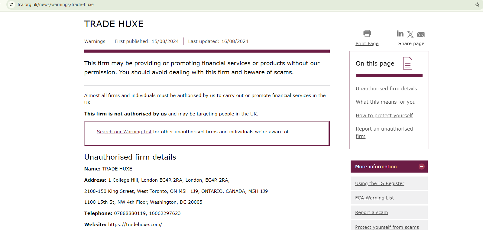 In addition, the Financial Conduct Authority (FCA) has issued a warning about TRADE HUXE, advising investors to stay away from this unauthorized firm as it may be part of potential dubious schemes.