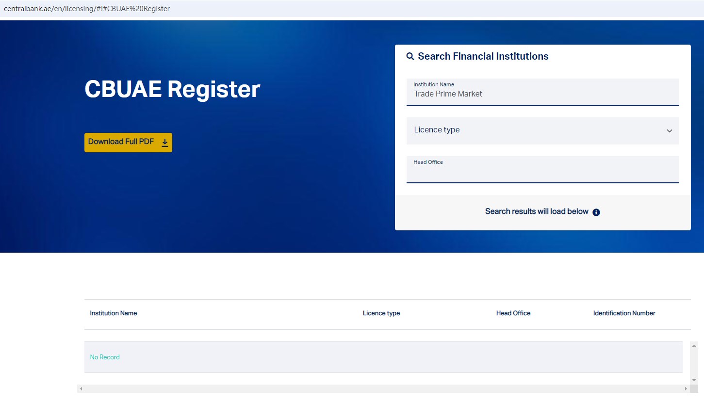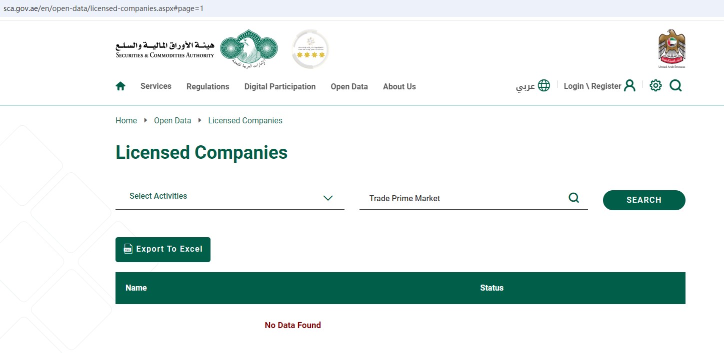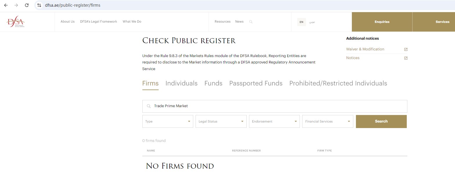 However, Trade Prime Market Limited is also not authorized and regulated by the DuBai Financial Services Authority (DFSA), the Central Bank of U.A.E.(CBUAE), the Securities and Commodities Authority(SCA) in the United Arab Emirates.