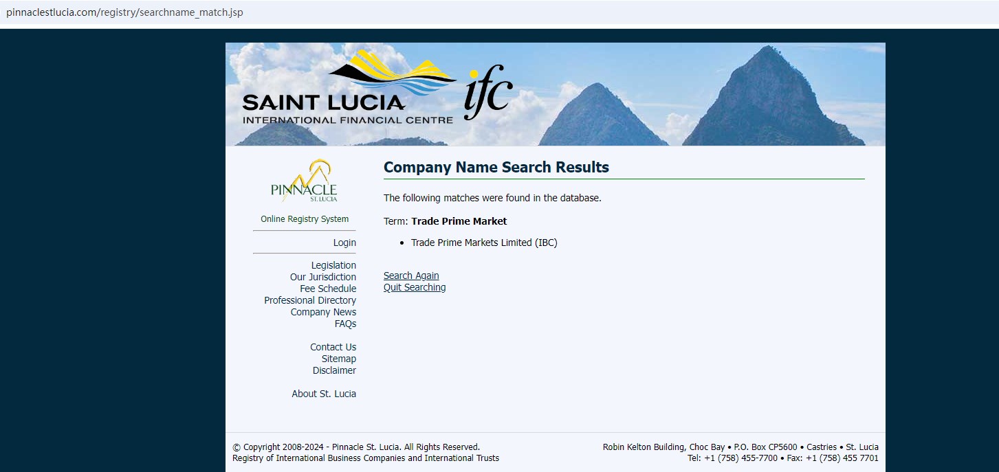 Upon investigation, we found that Trade Prime Market Limited is registered with the International Financial Centre (IFC) in Saint Lucia, an International Business Companies Registry that doesn't license forex trading brokerage activities. it is critical to note that this mere registration doesn't mean being licensed to carry on forex trading activities. The financial watchdog of St. Lucia, Financial Services Regulatory Authority (FSRA) has stated that forex trading activities are not licensed there. Without any other valid financial licenses, Trade Prime Market's financial services for forex trading are not legitimate.