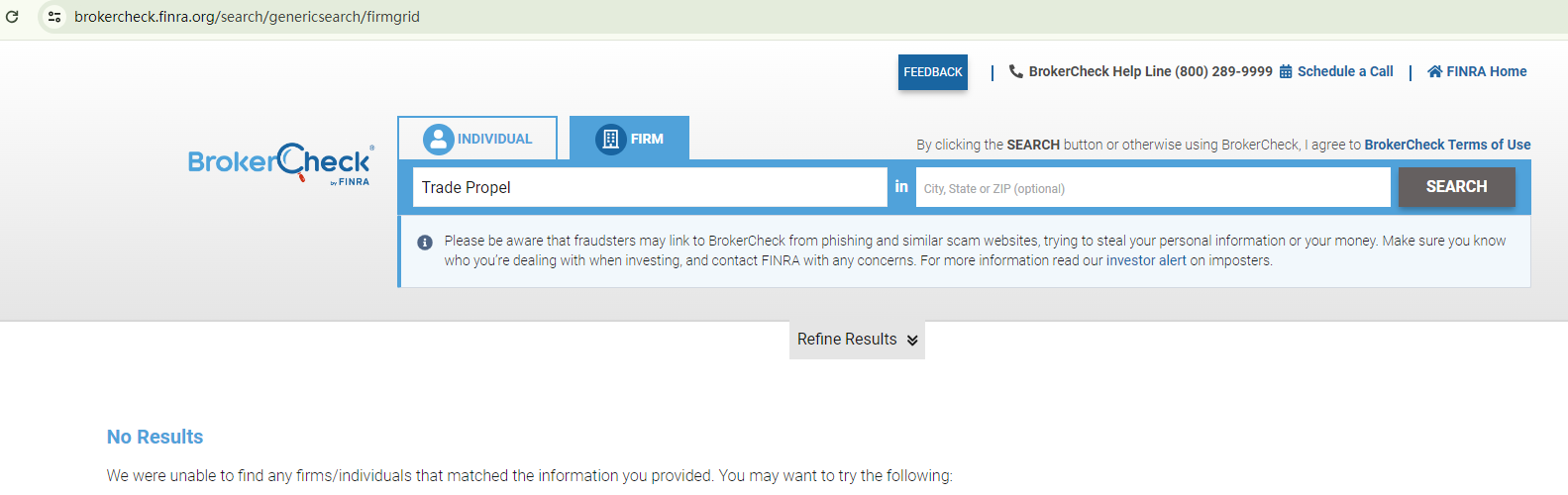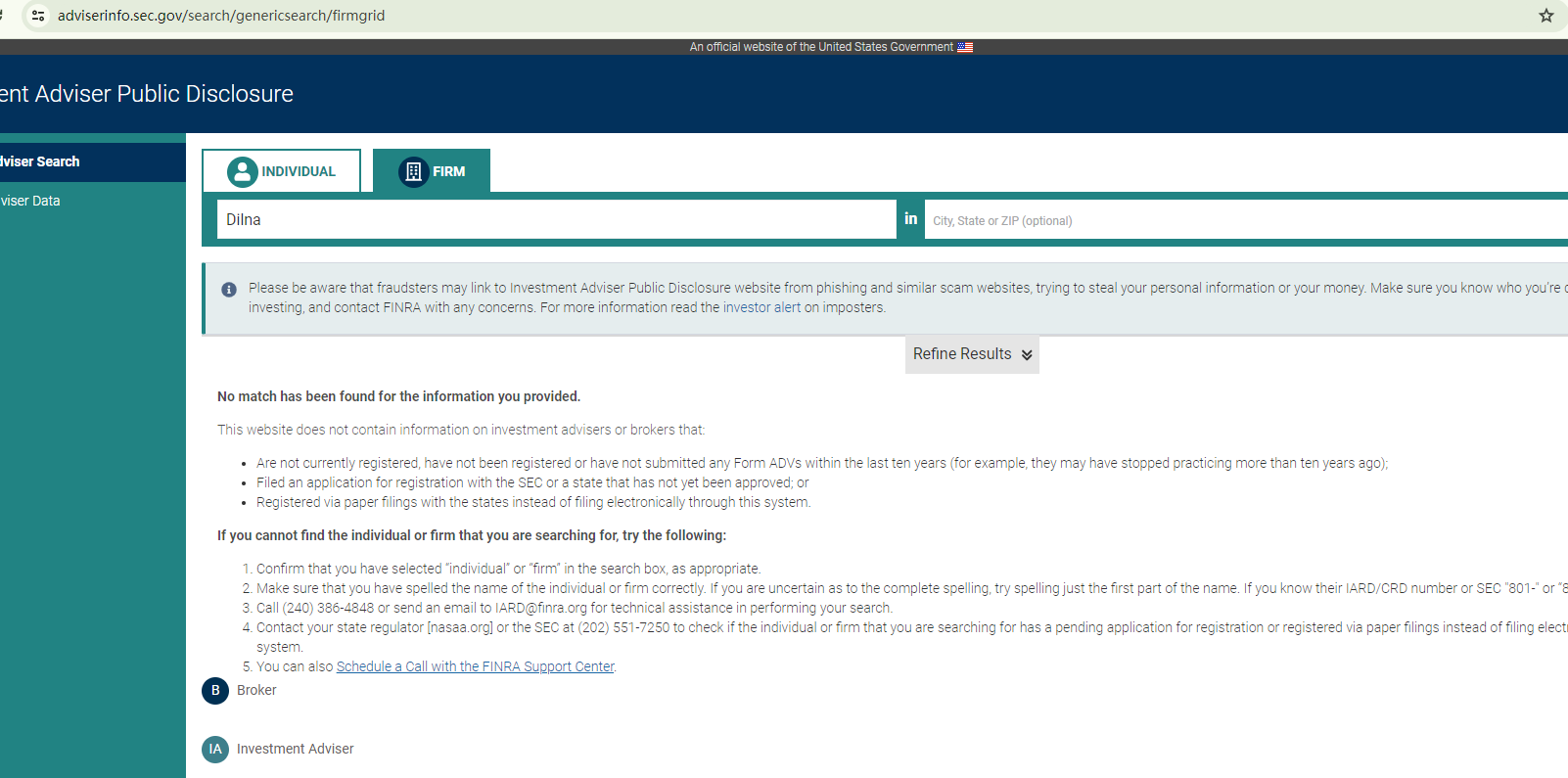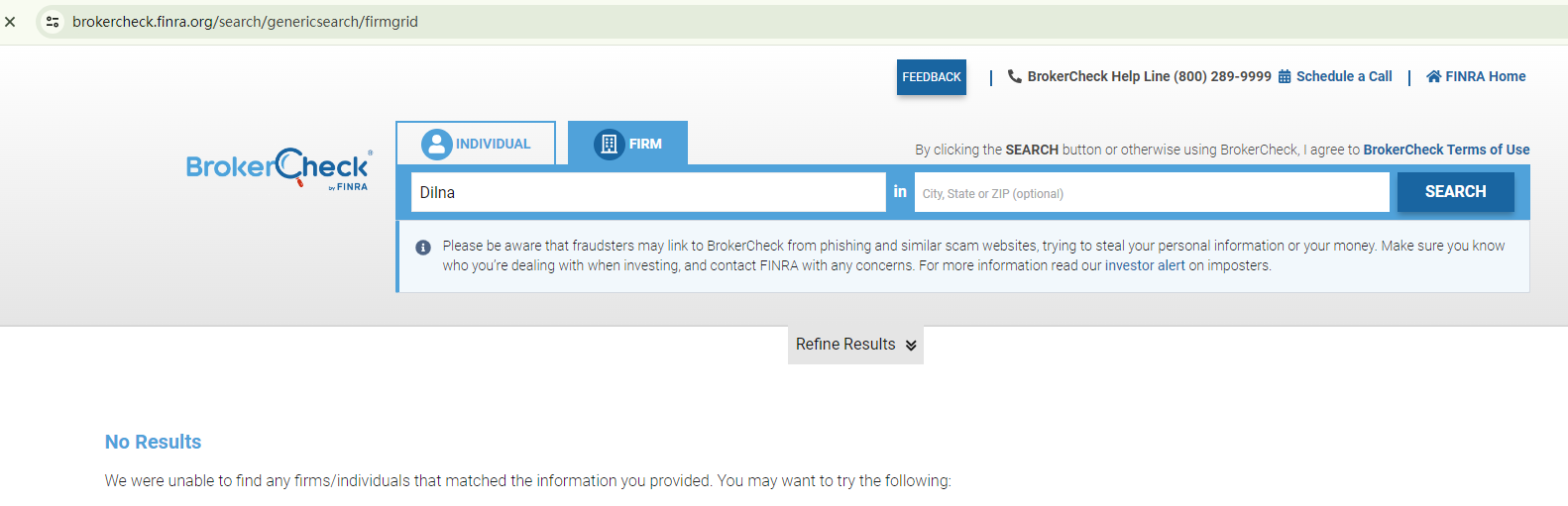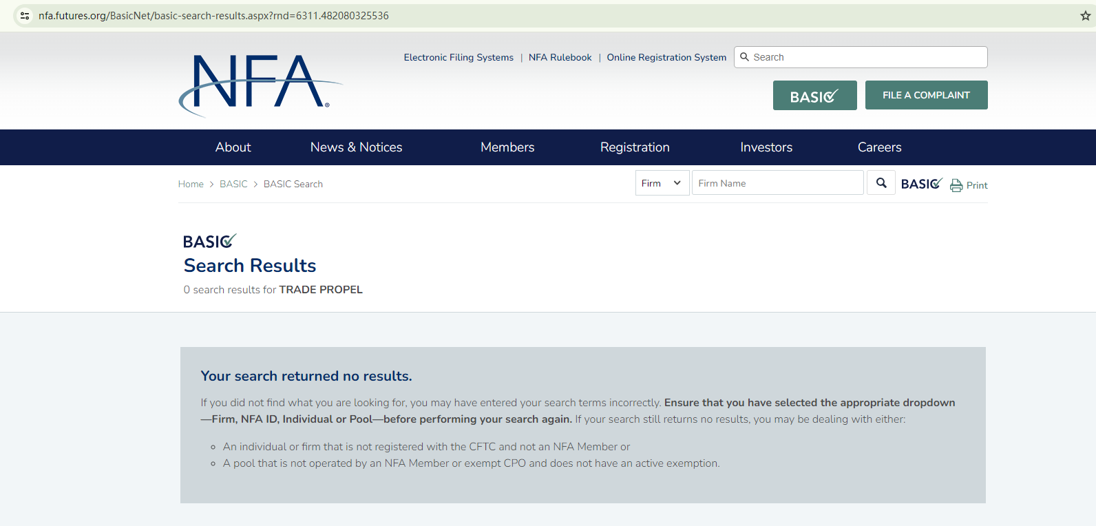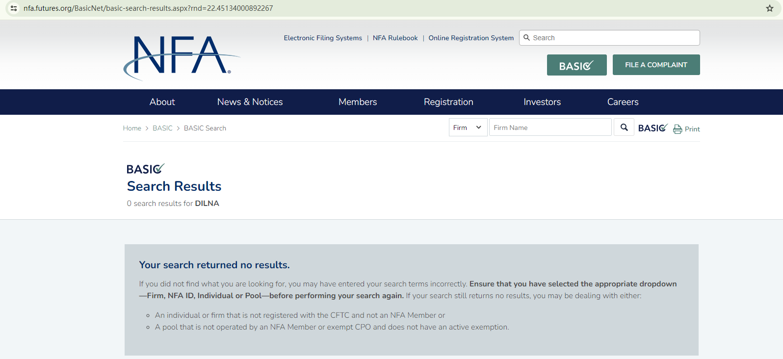 However, our investigation reveals a different story. Neither "Dilna" nor "Trade Propel" has corresponding records in the registers of the aforementioned financial regulators or agencies. It is critical to note that registration and examination of intermediaries are conducted on behalf of the CFTC by the National Futures Association (NFA) under the supervision of the CFTC. Therefore, we searched the keywords in the NFA register for the alleged CFTC registration.