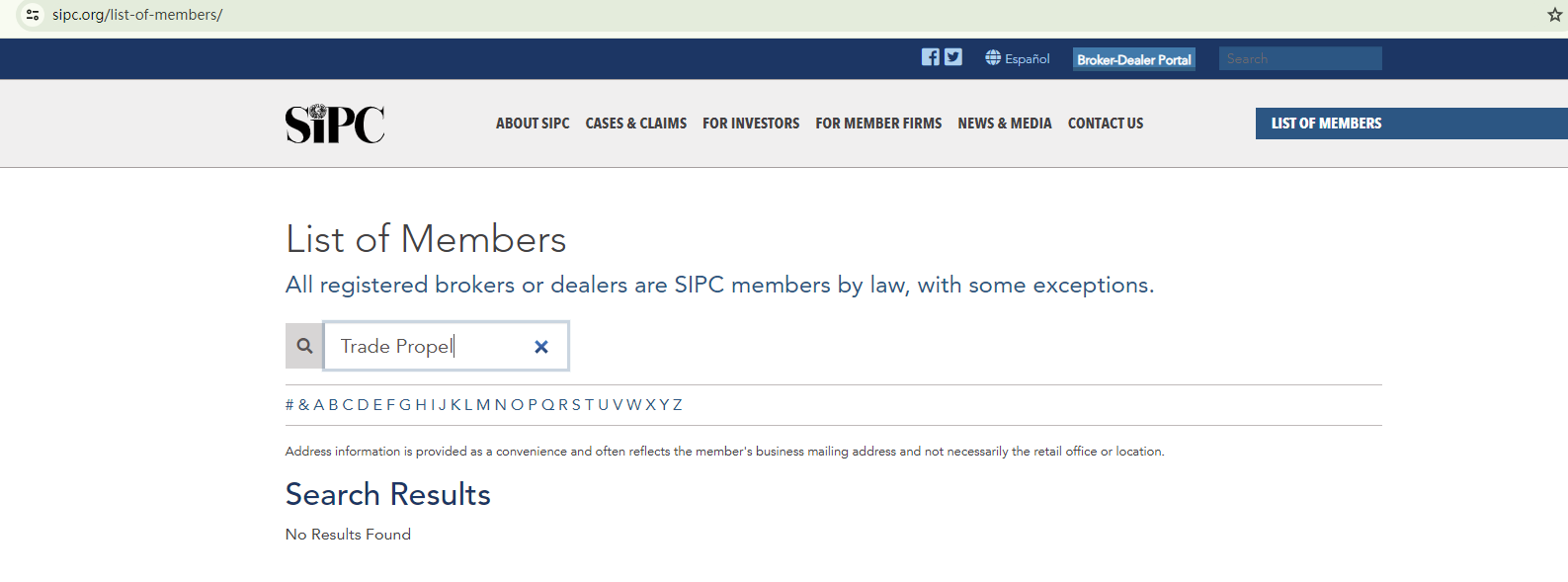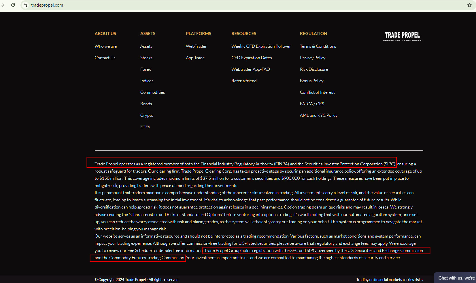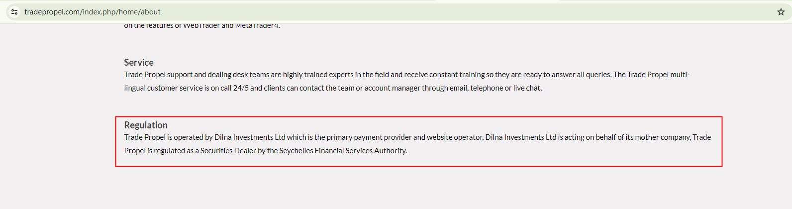 Trade Propel claims to be operated by Dilna Investments Ltd. The broker asserts to be a Securities Dealer regulated by the Seychelles Financial Services Authority (Seychelles FSA). In line with its purported location in the US, it further alleges to be a member of both the Financial Industry Regulatory Authority (FINRA) and the Securities Investor Protection Corporation (SIPC), and supposedly to be supervised by the U.S. Securities and Exchange Commission (SEC) and the Commodity Futures Trading Commission (CFTC).