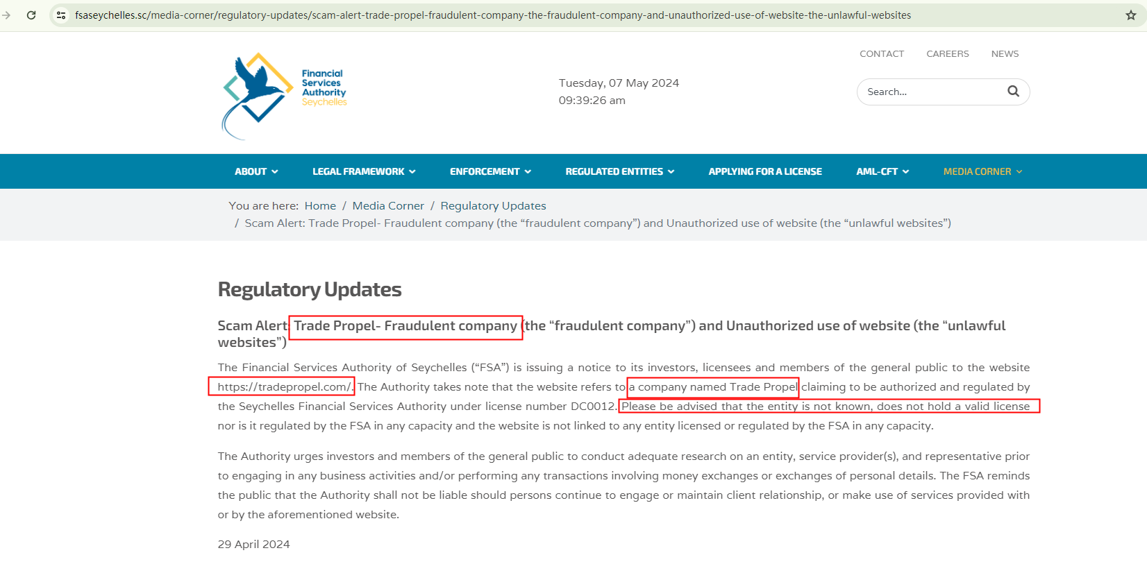On 29 April, 2024, the Seychelles Financial Services Authority (Seychelles FSA) issued a warning against Trade Propel, identifying it as a fraudulent company. https://fsaseychelles.sc/media-corner/regulatory-updates/scam-alert-trade-propel-fraudulent-company-the-fraudulent-company-and-unauthorized-use-of-website-the-unlawful-websites