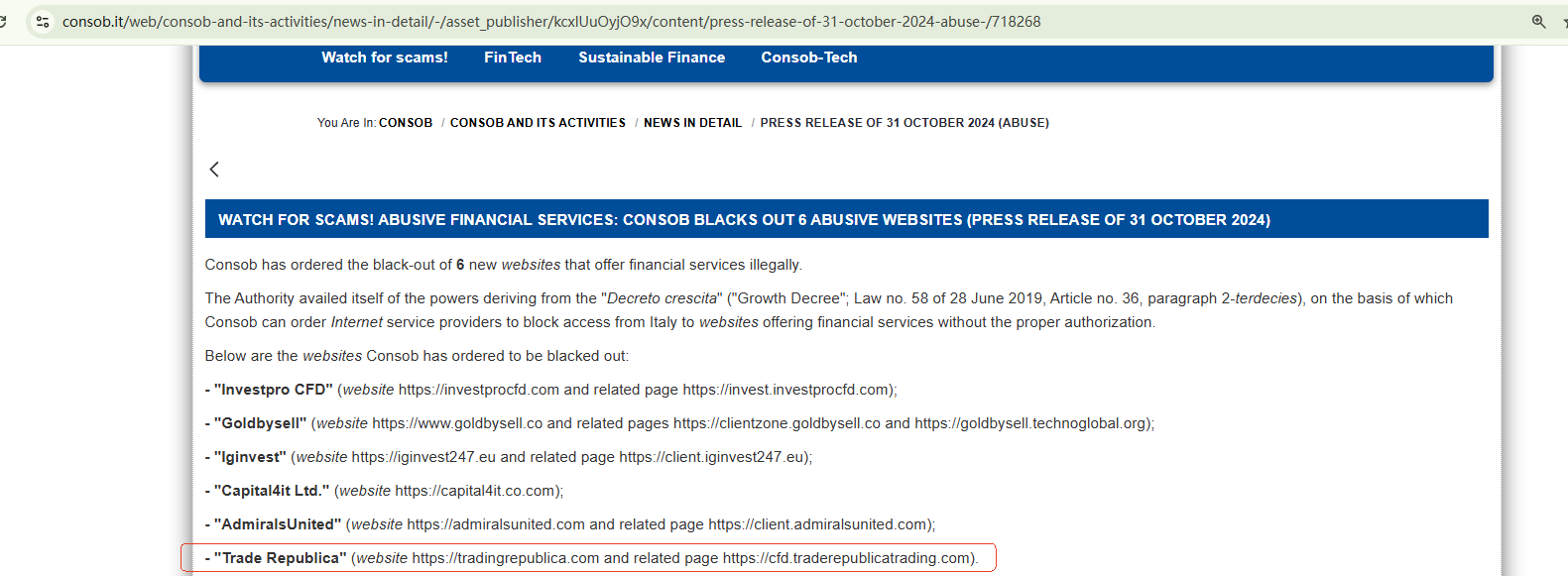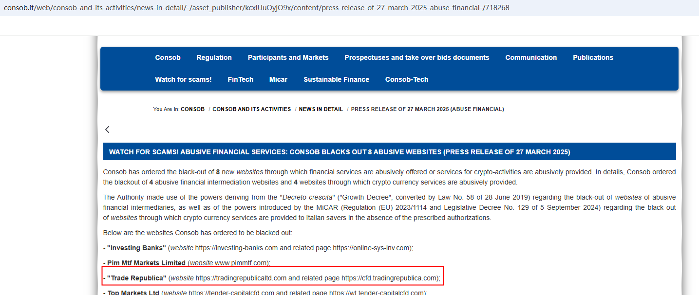 On March 27, 2025, the Italian Companies and Exchange Commission (CONSOB) ordered TRADE REPUBLICA to be blacked out since it offer financial services illegally in Italy. https://www.consob.it/web/consob-and-its-activities/news-in-detail/-/asset_publisher/kcxlUuOyjO9x/content/press-release-of-27-march-2025-abuse-financial-/718268